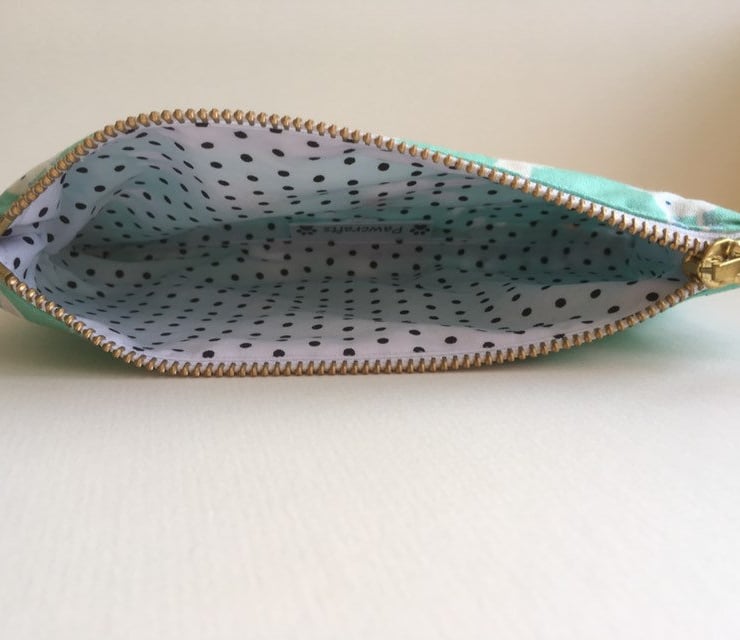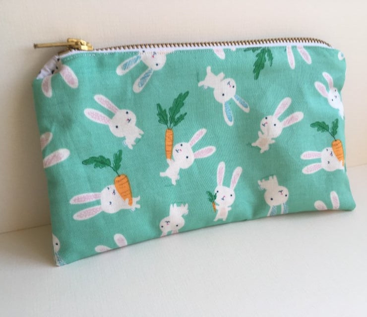 A lovely fabric pencil case in cotton fabric. A mainly Green background with gorgeous white bunnies & Carrots print.