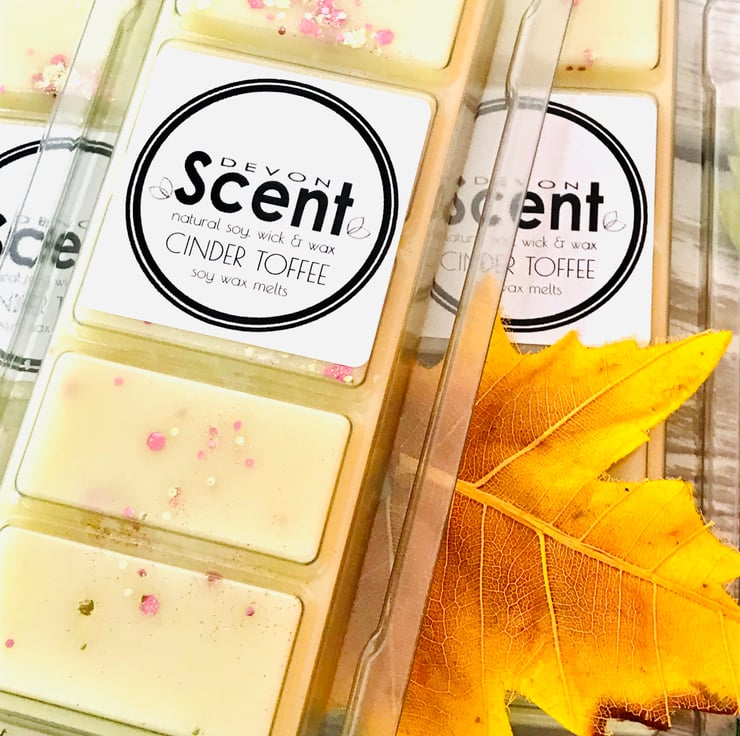 The scent from our Cinder Toffee Snap Bar Soy Wax Melts have a crunchy golden honeycomb fragrance with notes of caramelised sugar, toffee, vanilla and honey, with a hint of sweet cinnamon.