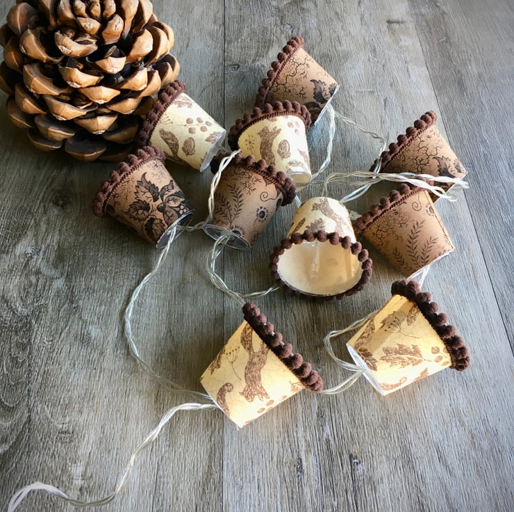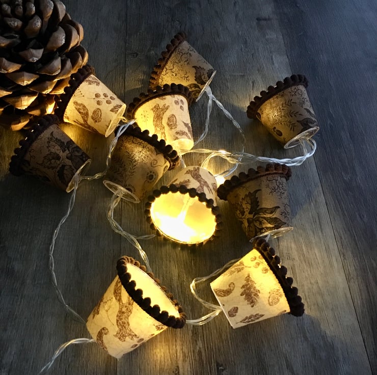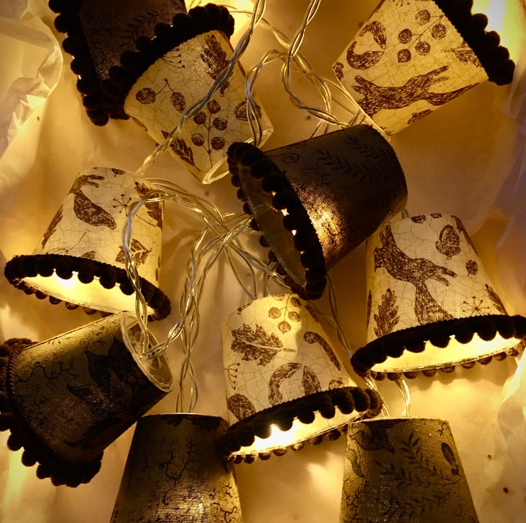 There are ten mini lampshades in each set on a battery-operated string of bright white fairy lights. The length overall length is 1.8 metres, and the length from first mini lampshade to last is 1.2 metres.