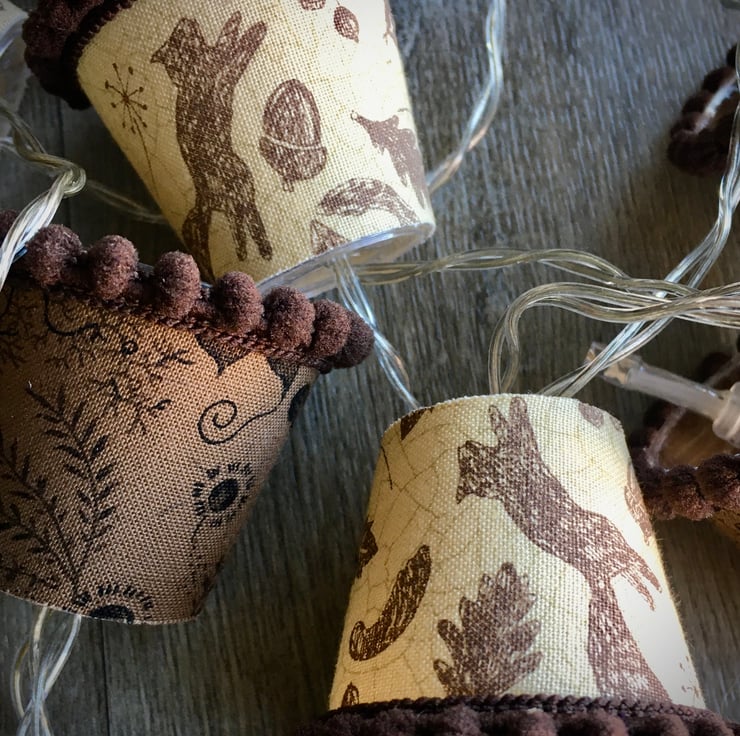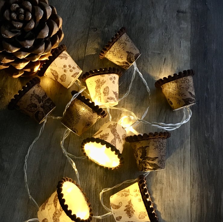 These mini lampshades are perfect to drape along a mantlepiece or shelf, around the head of a bed, or strung across a mirror or picture frame.