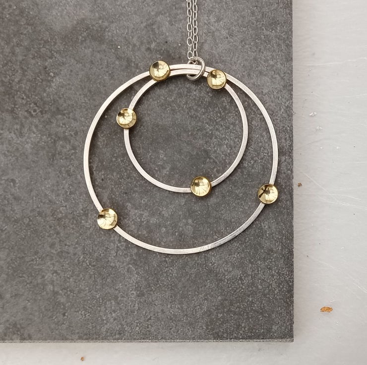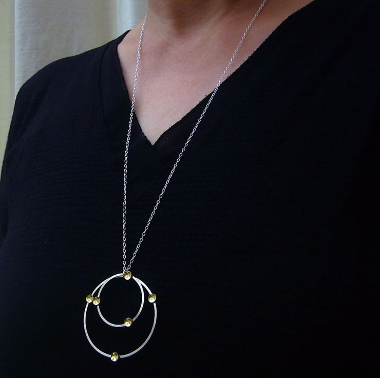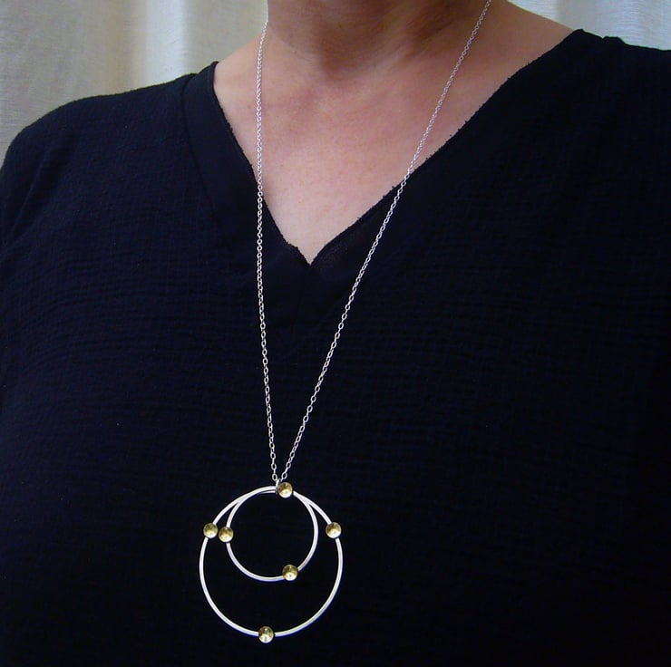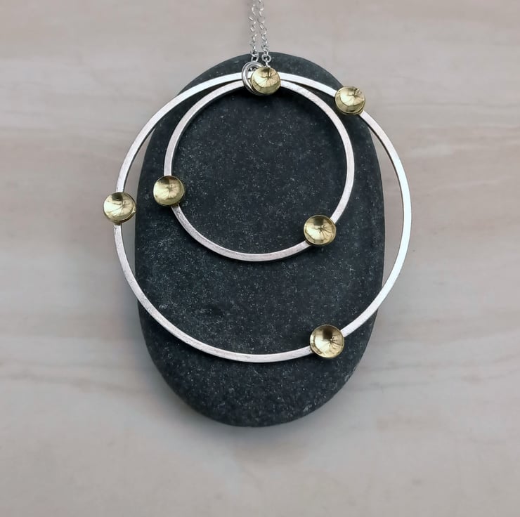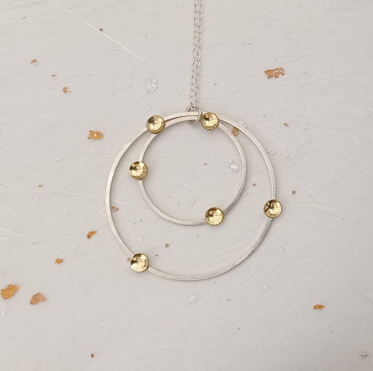 I have created this necklace by hand by cutting and shaping 1mm sterling silver square wire, then soldering tiny brass cups on top of the silver circles. After filing and finishing, the circles were attached to sterling silver chain. It has been designed by myself and is part of a collection of square wire jewellery.