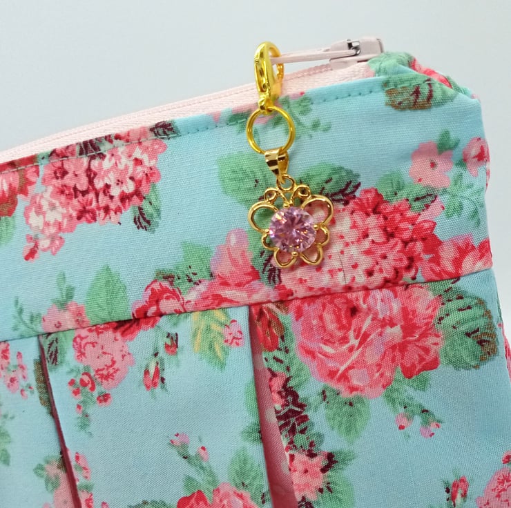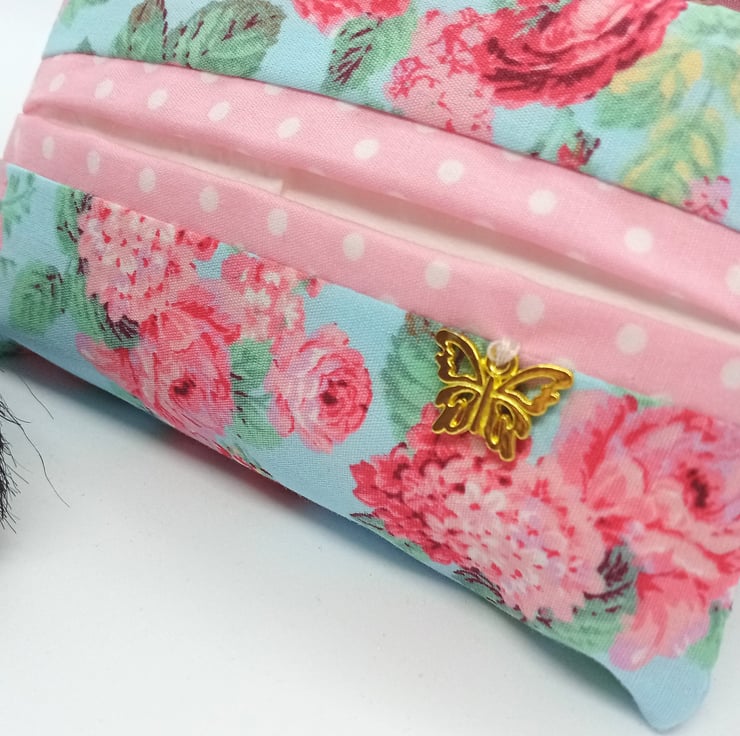 The pouch is wadded and lined in pink and white spotted cotton which is also the lining for the tissue holder.