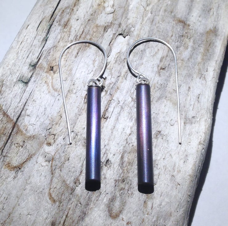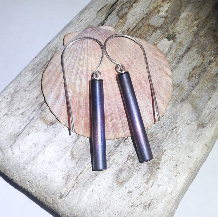 The titanium drops measure approximately 3.3 cm long and are set on handmade sterling silver fittings and hung from handmade sterling silver earring loops.