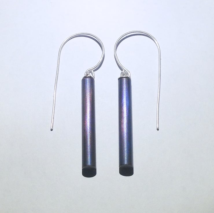These titanium earrings display a subtle range of dark attractive shades which appear subdued then come to life when the light hits them.