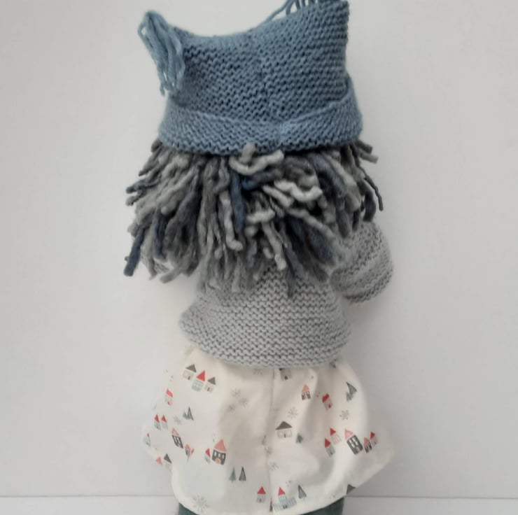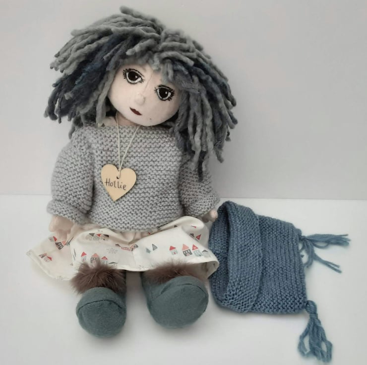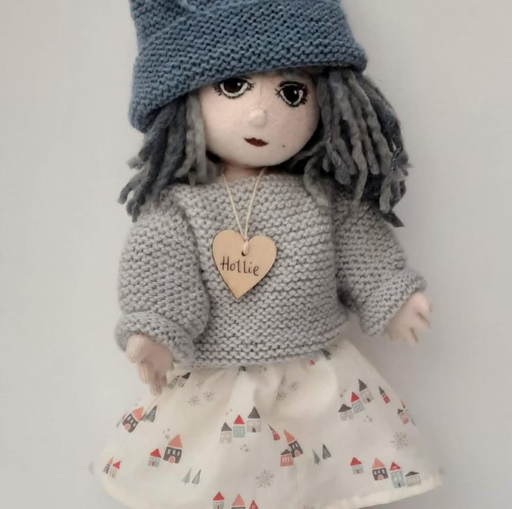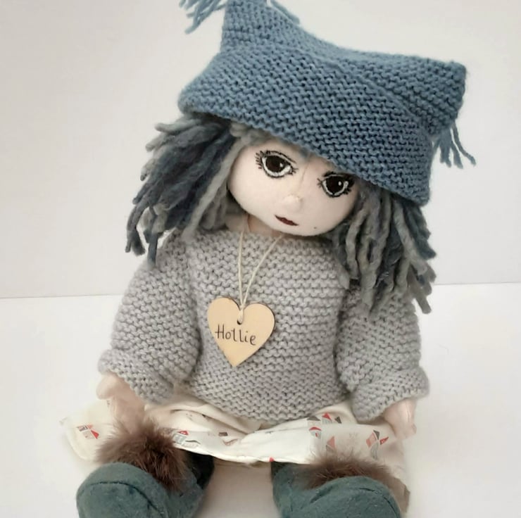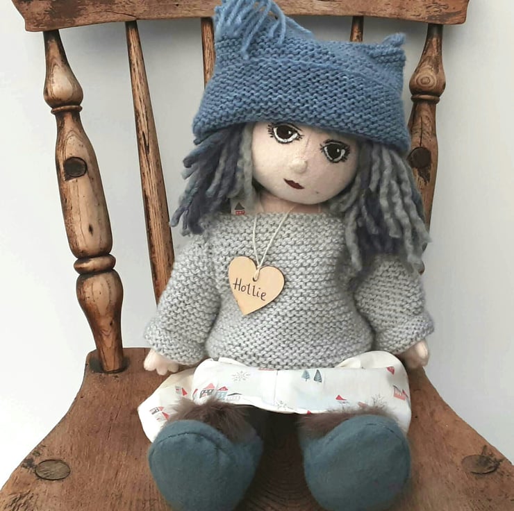 Meet Hollie, a unique, one off winter doll. 16" tall and hand made from luxury doll velour fabric in doll face pink.