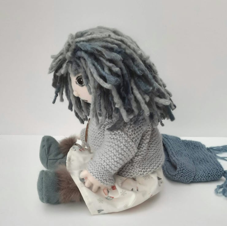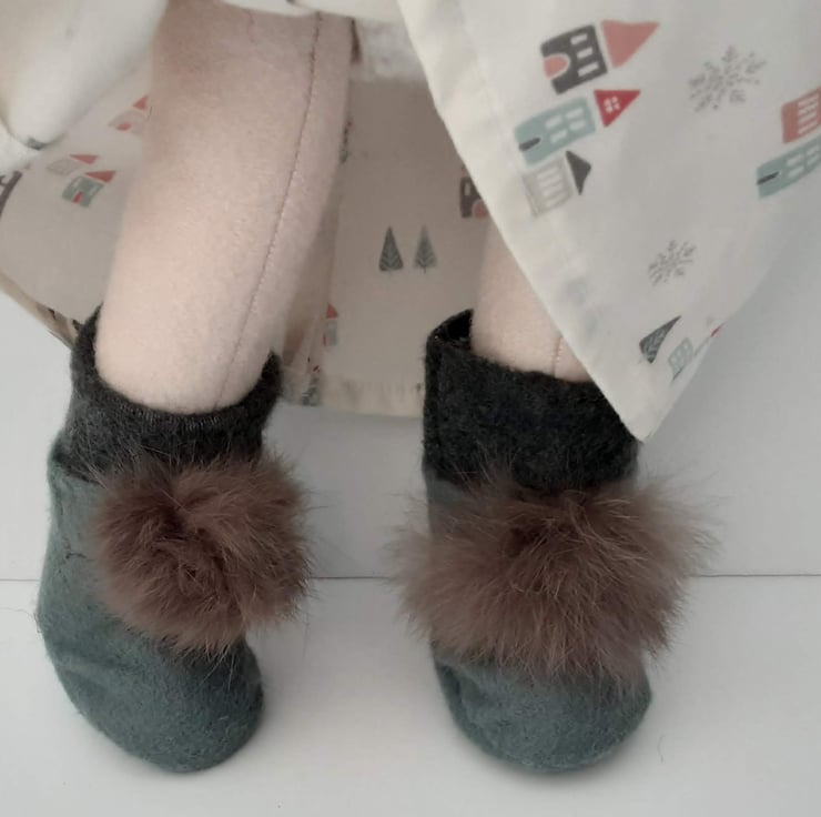 Her boots were made from wool felt and have a decorative fur pompom to the fronts. She has soft fleece, charcoal grey leg warmers tucked into her boots.