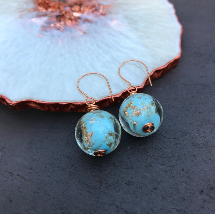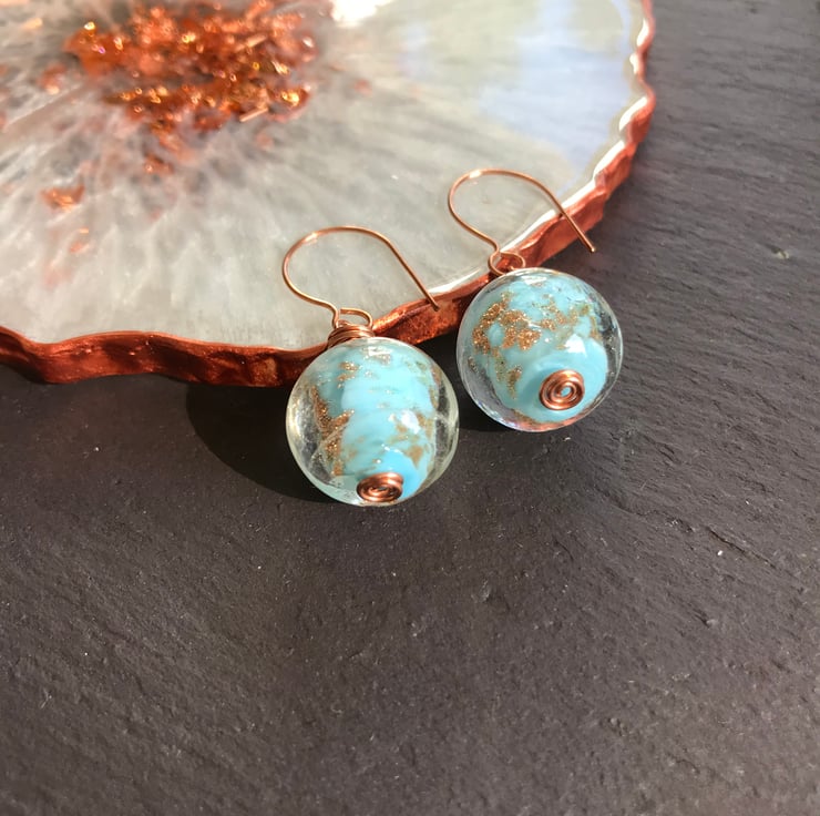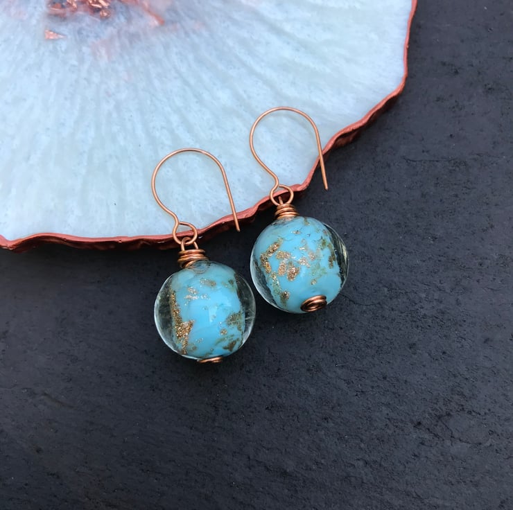 These lovely earrings are fully handmade from copper wire, including the ear wires. The copper dust inside the lampwork beads catches the light beautifully as they move.