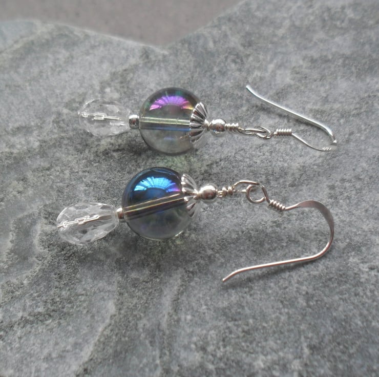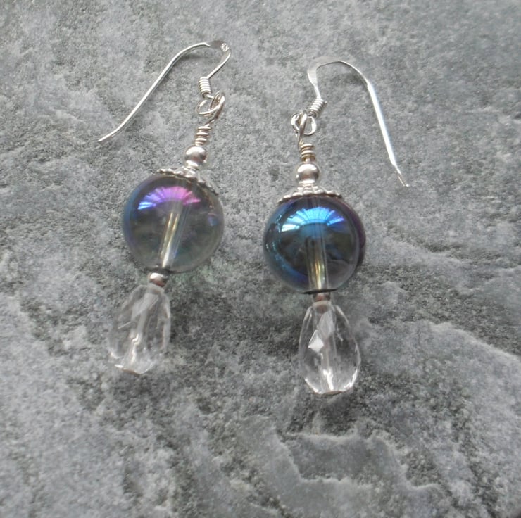 Mystic coated quartz which look like little bubbles of colour with shades of blue and lilac as they move in the light and drops of white quartz semi precious gemstones are attached to sterling silver ear wires