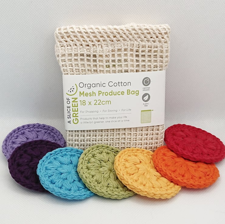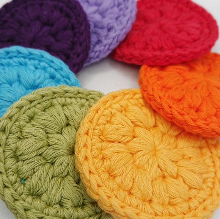 Reusable/Washable Cotton Rainbow Crochet Face Pads x7 with a mesh bag for washing