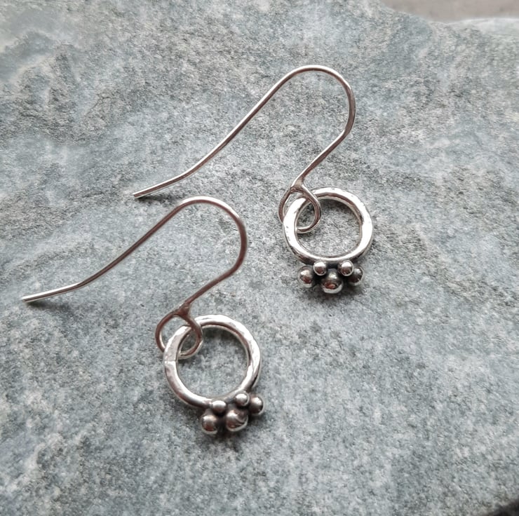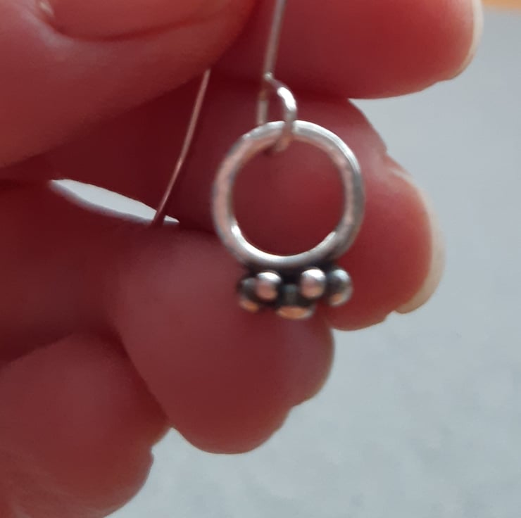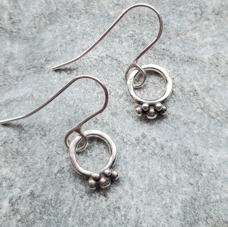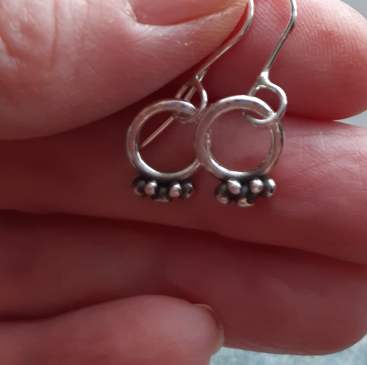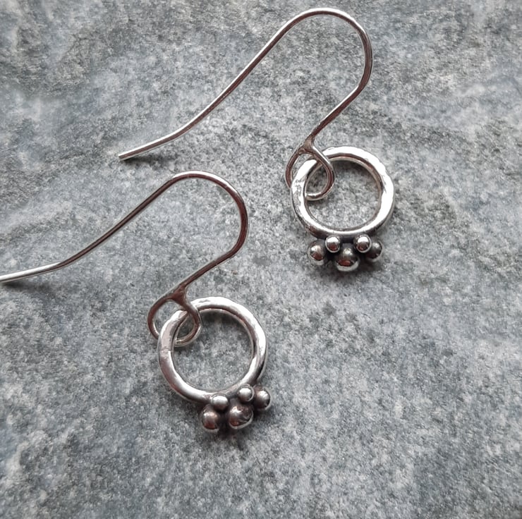 These dainty hoop earrings have been made out of argentium silver wire which has been formed into a circle soldered and lightly hammered to give a little texture. Small round shapes have been fused to the base of the hoops to give detail of little berries. The berries have been oxidised and polished back to enhance the detail The silver hoops have then been attached to argentium silver handmade ear wires