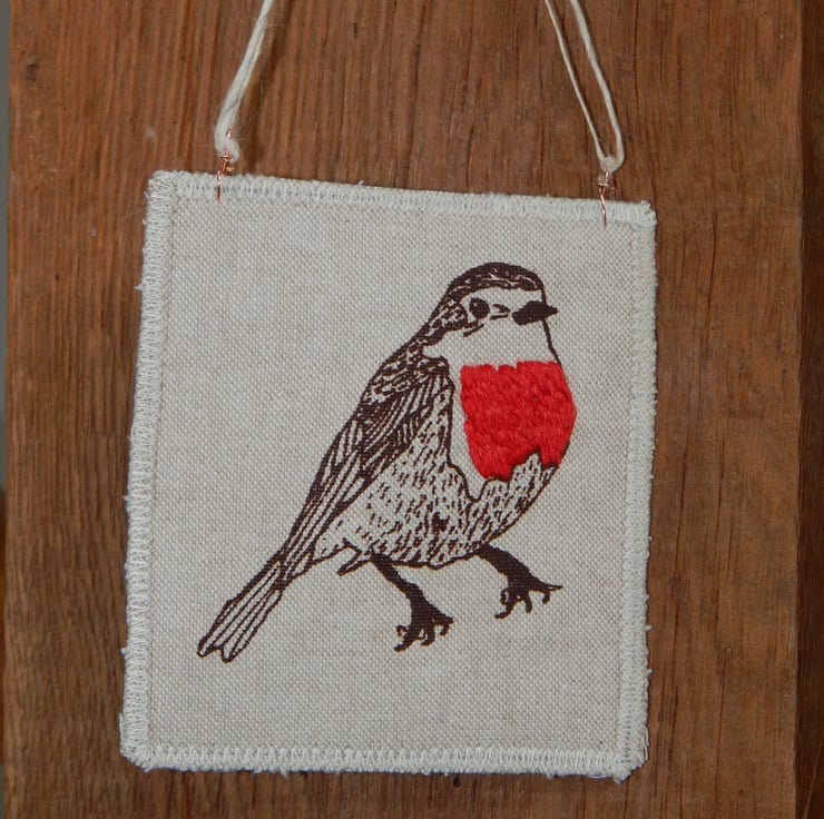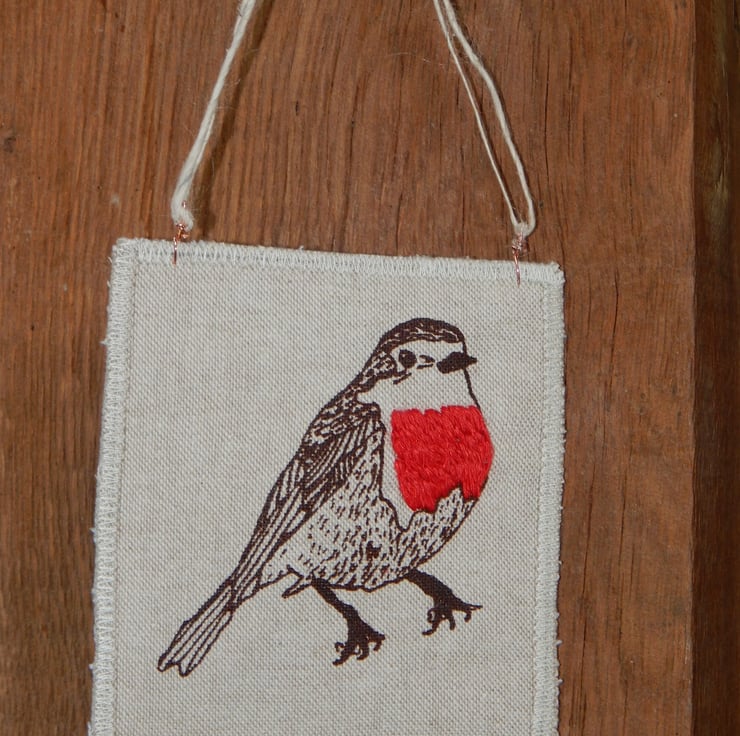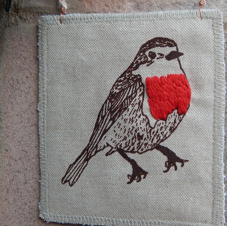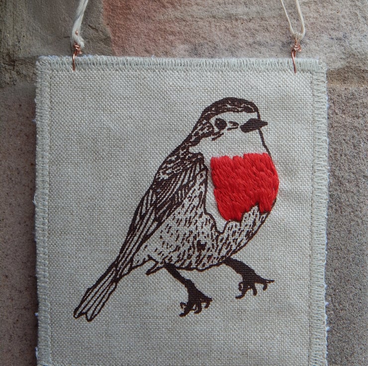 This is a hanger that I have screen printed a robin onto in dark brown, he has a hand embroidered red chest in linen thread. I have then attached 2 simple metal fixings on top to pop some nettle string for hanging. The edging has a zig-zag stitching to prevent fraying.