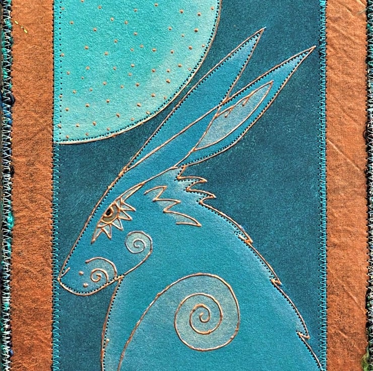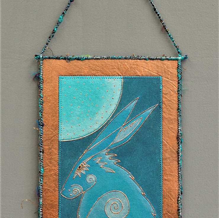 HHP161 - Hand printed/painted hare and moon design. Painted background on stiffened fabric plus mixed, stitched yarn edging and hanging loop. Plain black on reverse with rayon stitching.