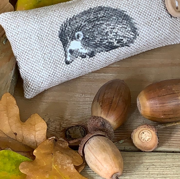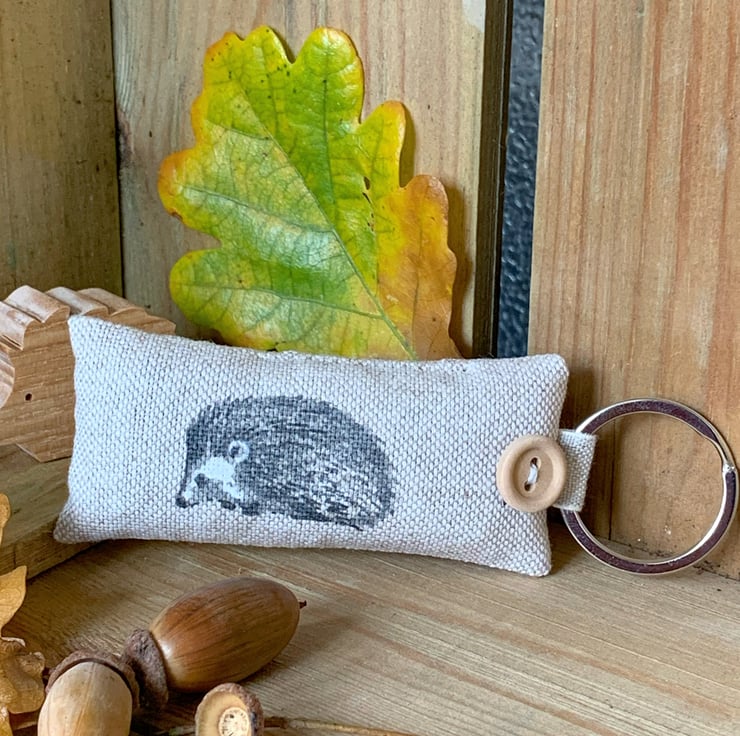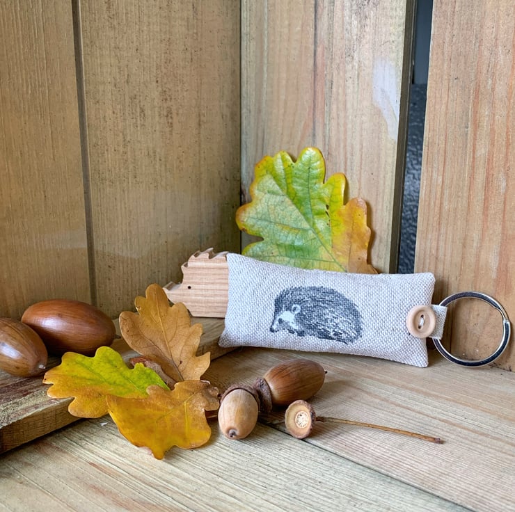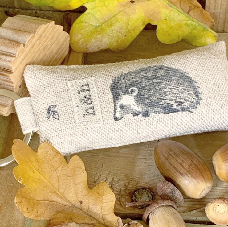 Handmade in my Hampshire garden studio, this fragrant and tactile key ring features the monochrome hedgehog on a taupe background. Finished with a rustic wooden button on one side and a linen 'h&h' label on the other side, the silver metal ring is attached with a linen tape loop.