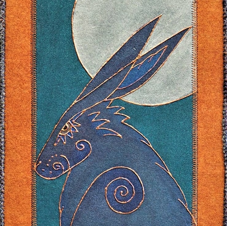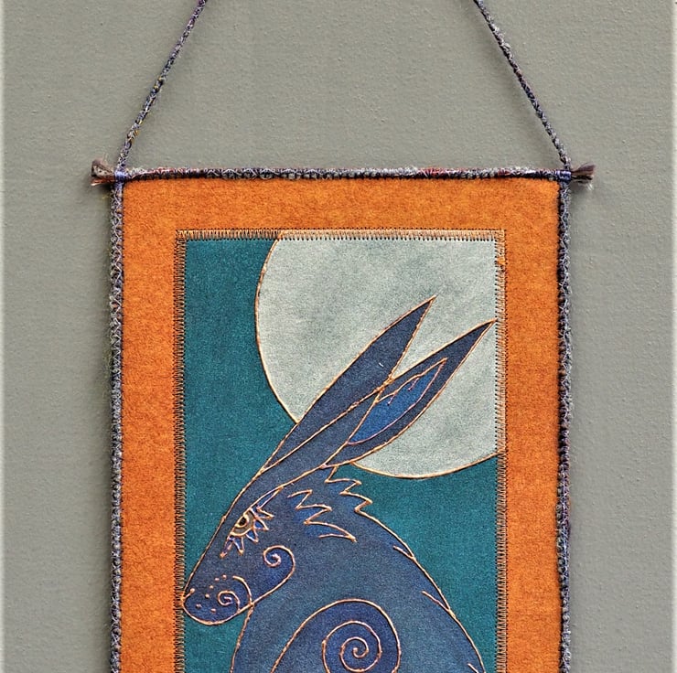HHP163 - Hand printed/painted hare and moon design. Painted background on stiffened fabric plus mixed, stitched yarn edging and hanging loop. Plain black on reverse with pewter colour stitching. Please just contact me if you have a specific colours you'd like made as a commission.