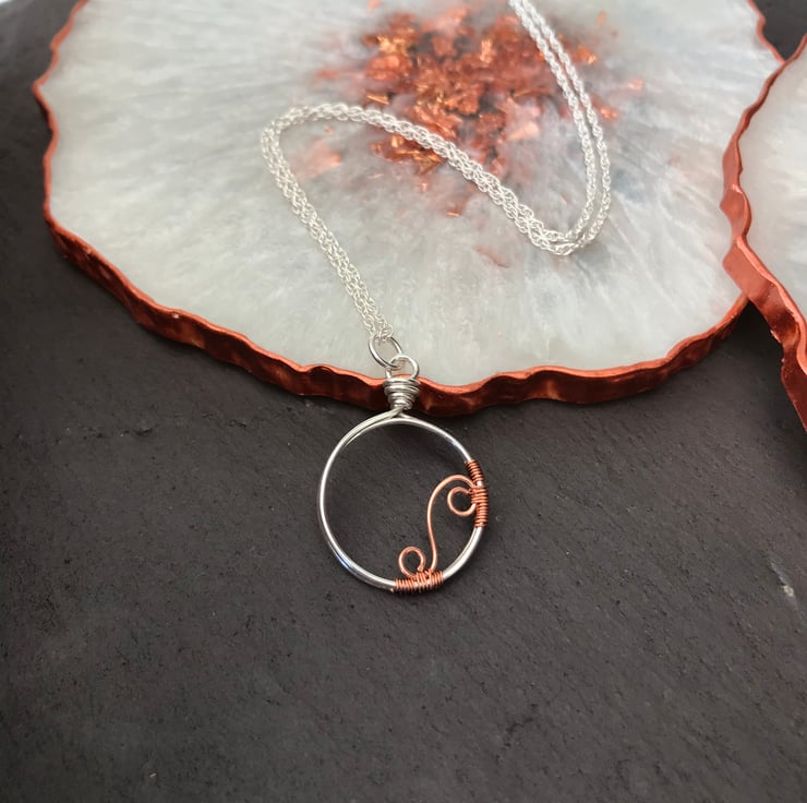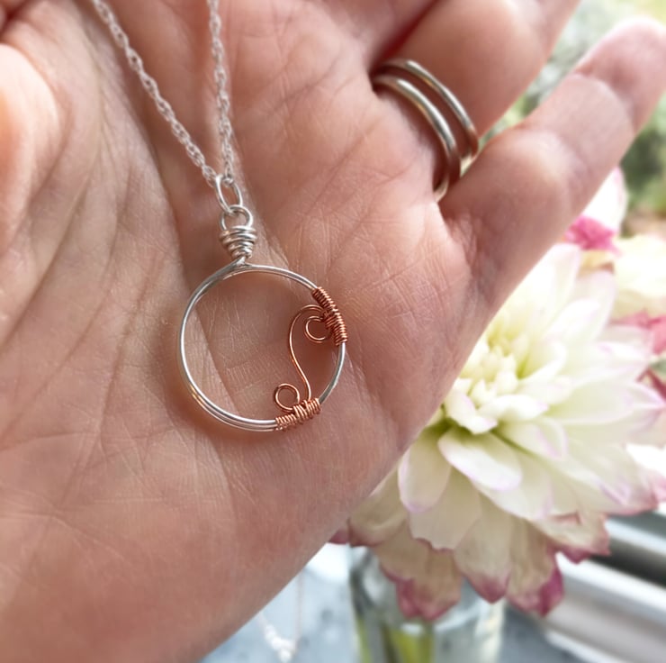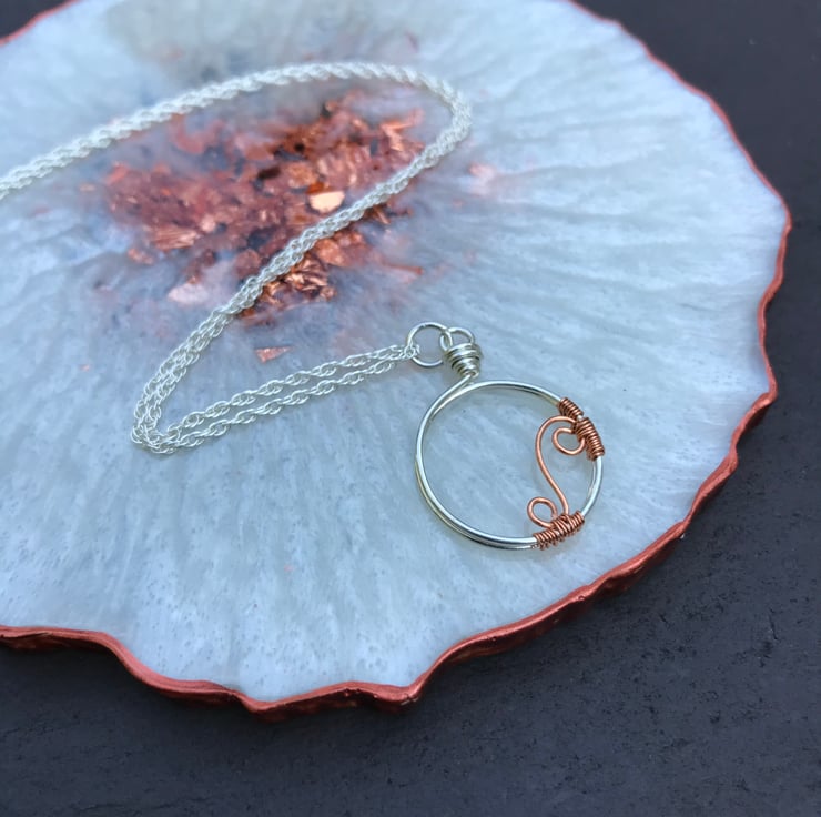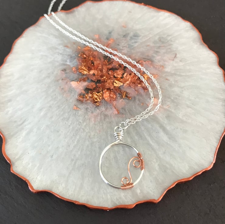 This gorgeous minimalist pendant is fully handmade from recycled Sterling Silver wire with a copper wire scroll accent. It hangs from a 16 inch sterling silver rope chain, also known as a Prince of Wales chain.