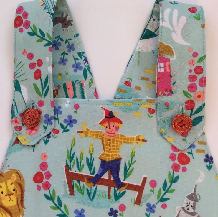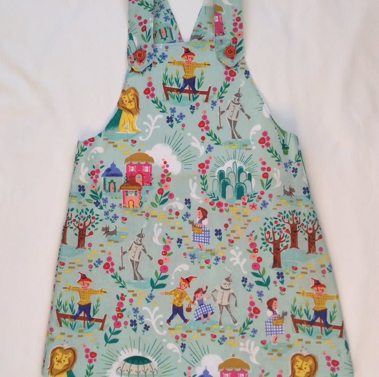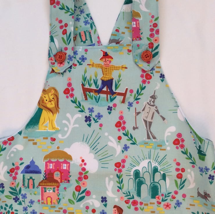 Wonderful Wizard of Oz dress, fabric features favourite characters from the classic story. Pinafore fastens at shoulders with glittery ruby buttons.