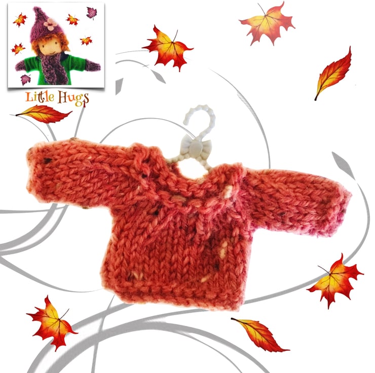 A cute little terracotta tweed jumper, made especially to fit the Little Hugs dolls. The jumper is hand-knitted in lovely soft wool and comes on a cute little hanger.
