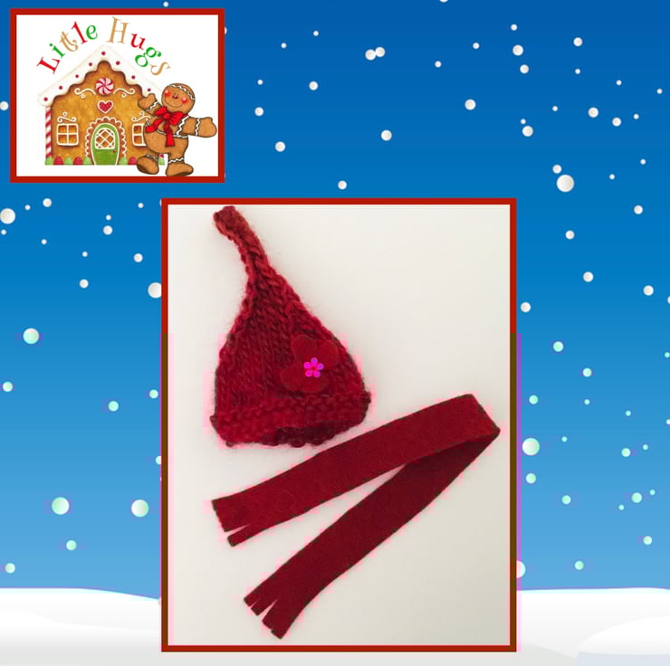 A cute little hand-knitted hat and matching felt scarf set to fit the Little Hugs dolls. The hat is knitted from lovely shaded wool and is decorated with a felt flower to match the scarf and a pretty little flower sequin - just the thing to keep Little Hug dolls warm now Winter is coming and there is a nip in the air.