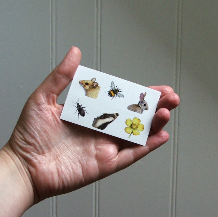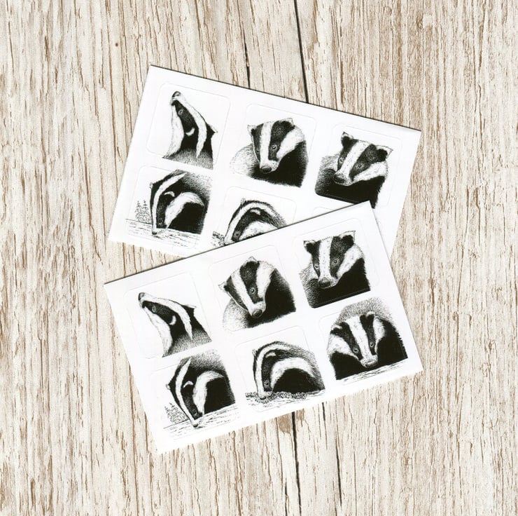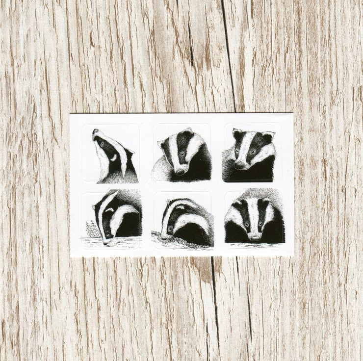 A set of 12 little 1 inch square (2.2cm) glossy, vinyl stickers illustrated with pen and ink wildlife from my original illustrations. This set includes six badgers in different poses, taken from my original pen and ink illustrations and consists of two sheets of six stickers.
