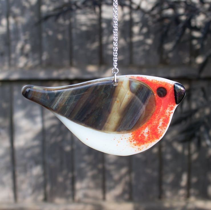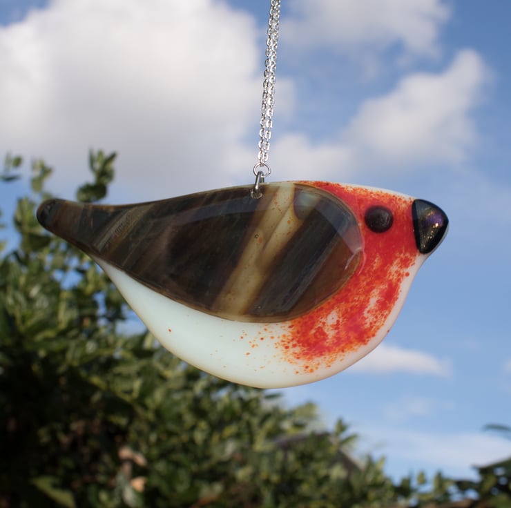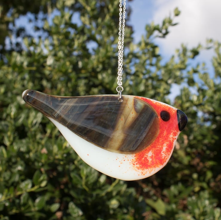 He is constructed from a piece of creamy white glass as the main body, over which we position a specially cut piece of streaky-brown glass. We then sprinkled on some red frit (powdered glass) to give him his iconic red breast. Add small pieces of black glass for his beak and eye, and pop him in the kiln for 12 hours. Once he's cooled down, we drilled a hole, added a jump ring and strung the chain.