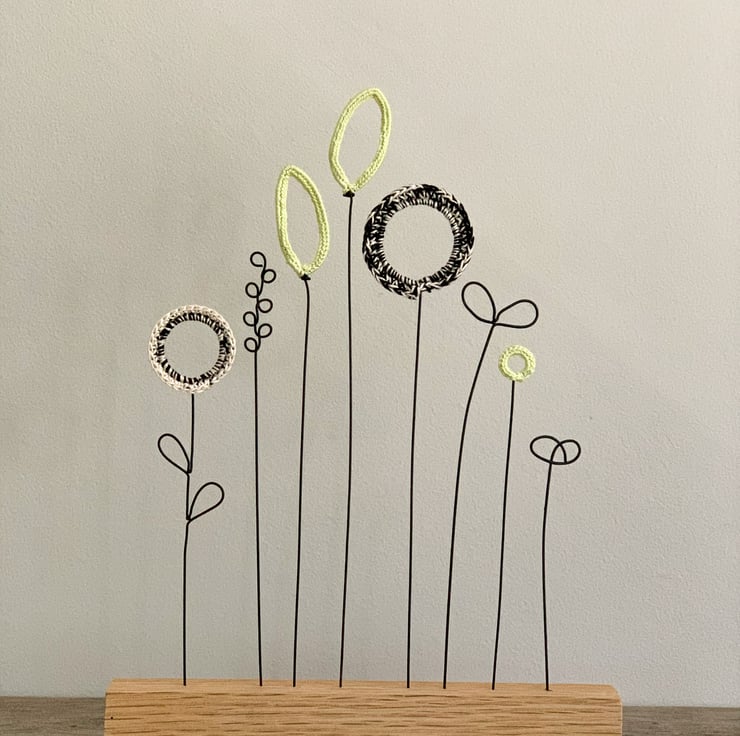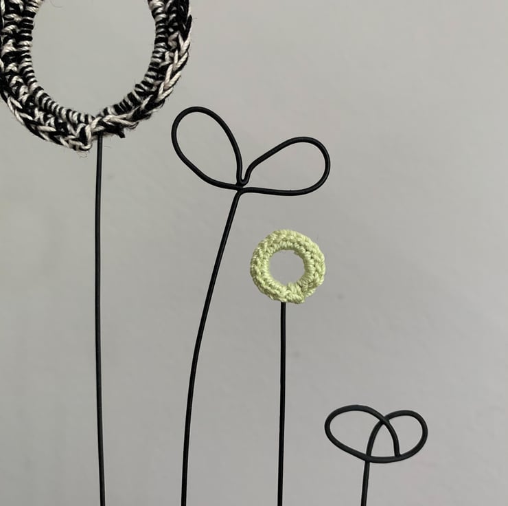 These everlasting flowers have first been shaped and then sprayed black to prevent the metal from rusting, before the flower heads are crocheted.
