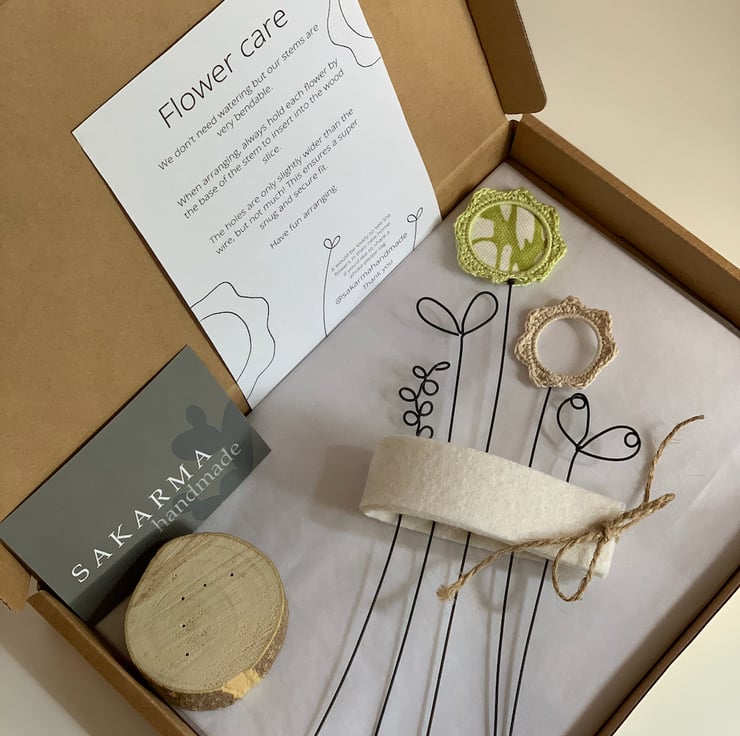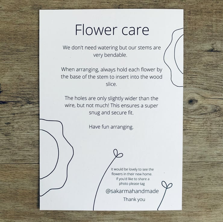 The flowers are removed from the wood slice for posting to keep them nice and flat. Each one is threaded through a thick piece of felt which is then tied with twine. This keeps the delicate flowers held firmly in place on their journey. The flowers are easily removed from the felt to arrange.