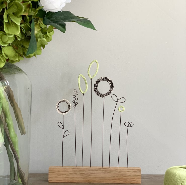 Wire flower stems with cotton crocheted flower heads add cheer to any space.