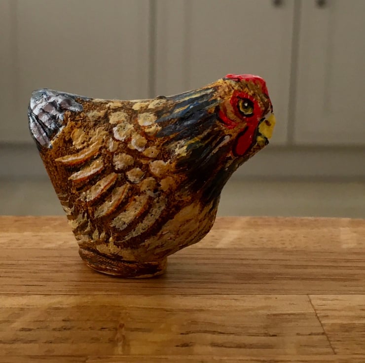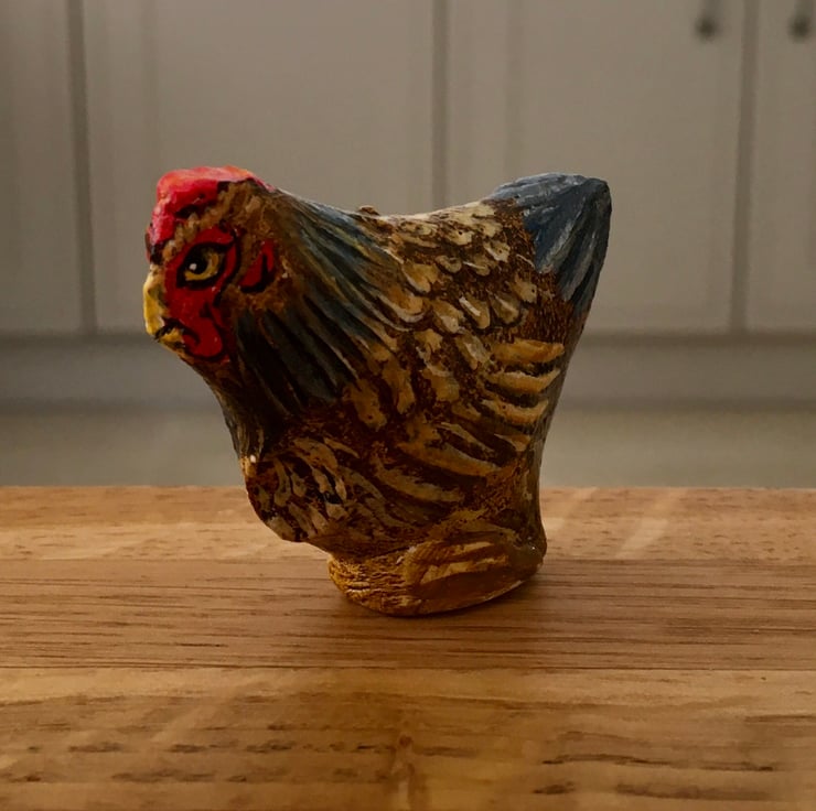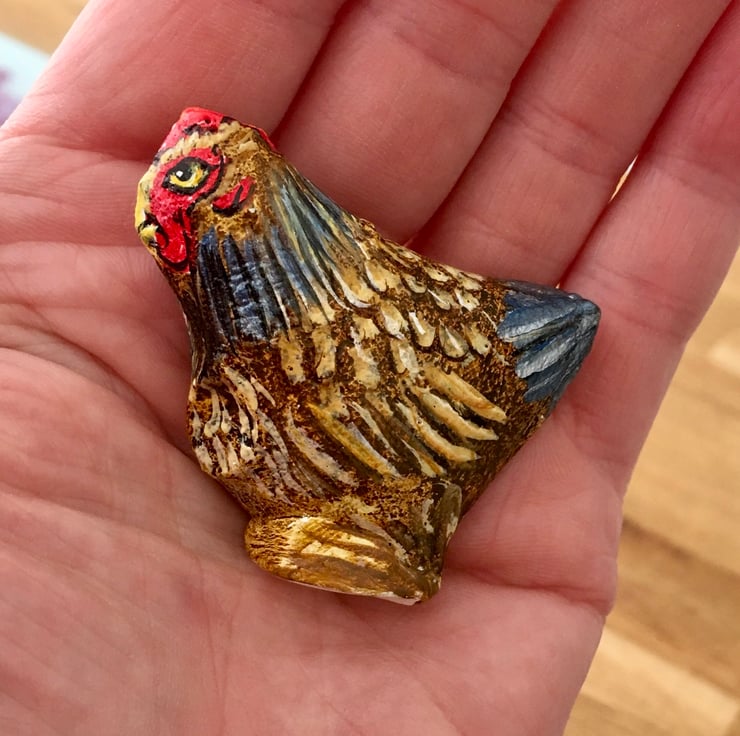 This is a stone shaped like a chicken which I have painted with acrylic paint and glazed for a glossy protective finish.