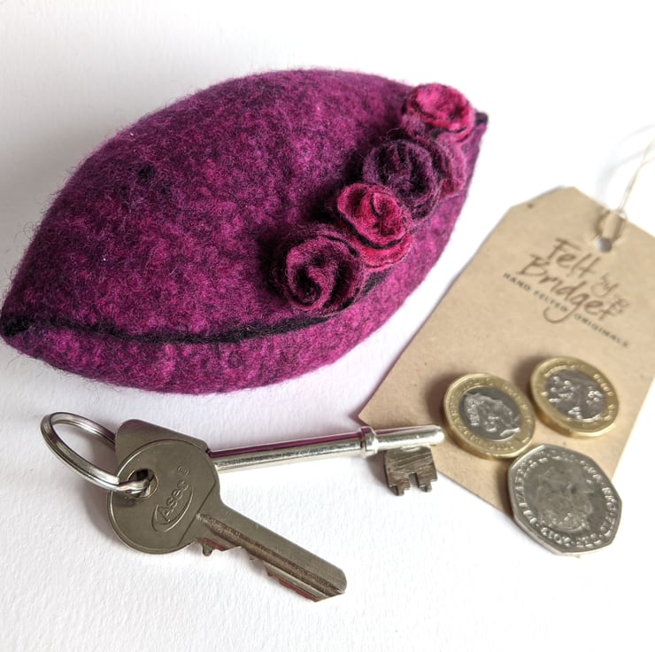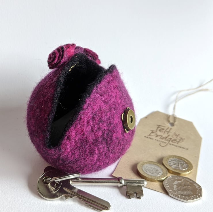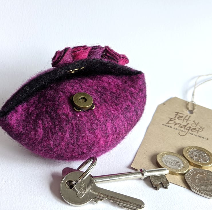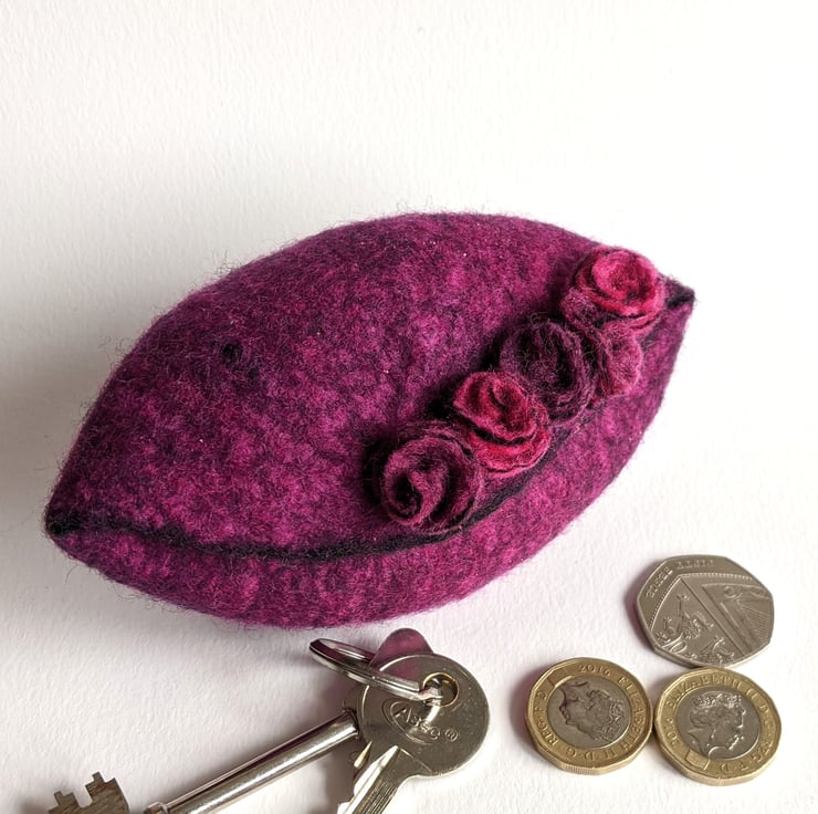 I make these from seamless spheres of handmade merino wool felt, shrunk and moulded into shape, then I add toning flowers and the magnetic closures. The underlying black layer of wool gives a lovely depth to the top colour.