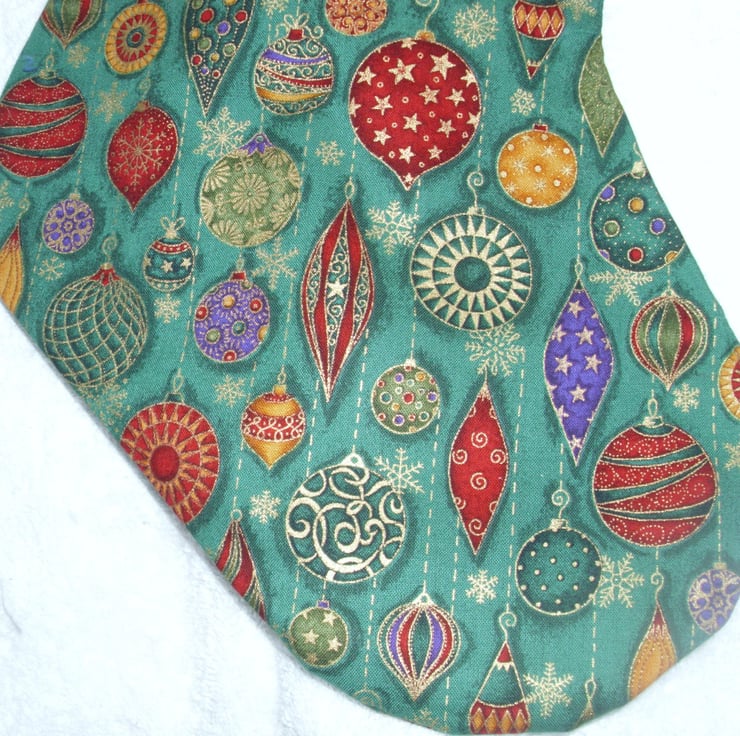 Multi coloured baubles in different shapes and sizes, greens, reds, gold, with spots, stripes and swirls ,all on a dark green cotton fabric stocking. top to bottom 44 cms, across top front to back 21 cms.