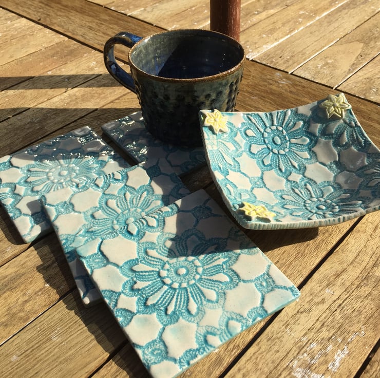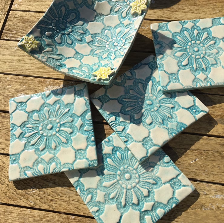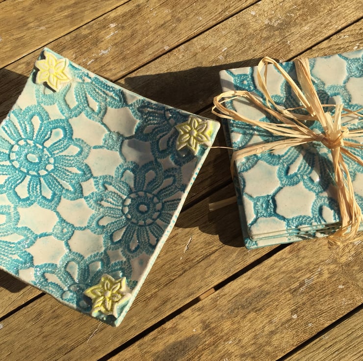 Set of 4, turquoise coasters with a matching trinket dish to decorate your coffee table. Textured for added interest. The trinket dish is 5 inches square (12.5 cms). Furniture protectors added to the rear of the coasters to protect your furniture. The coasters and the dish are classed as one item for postage costs.