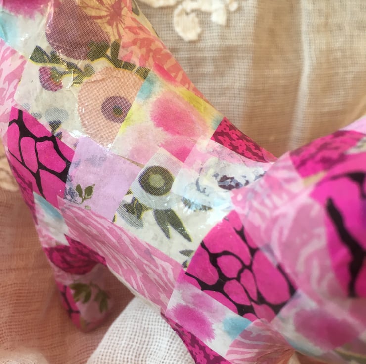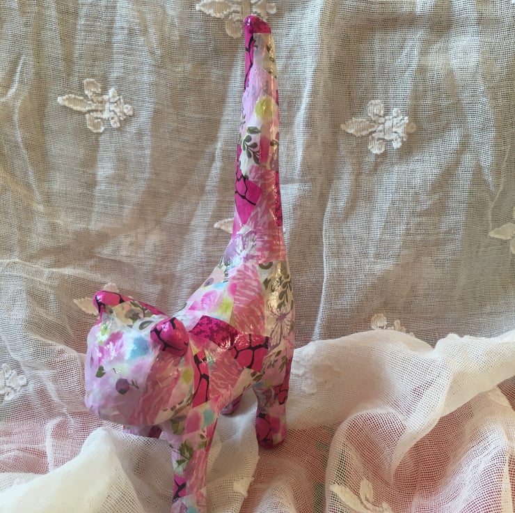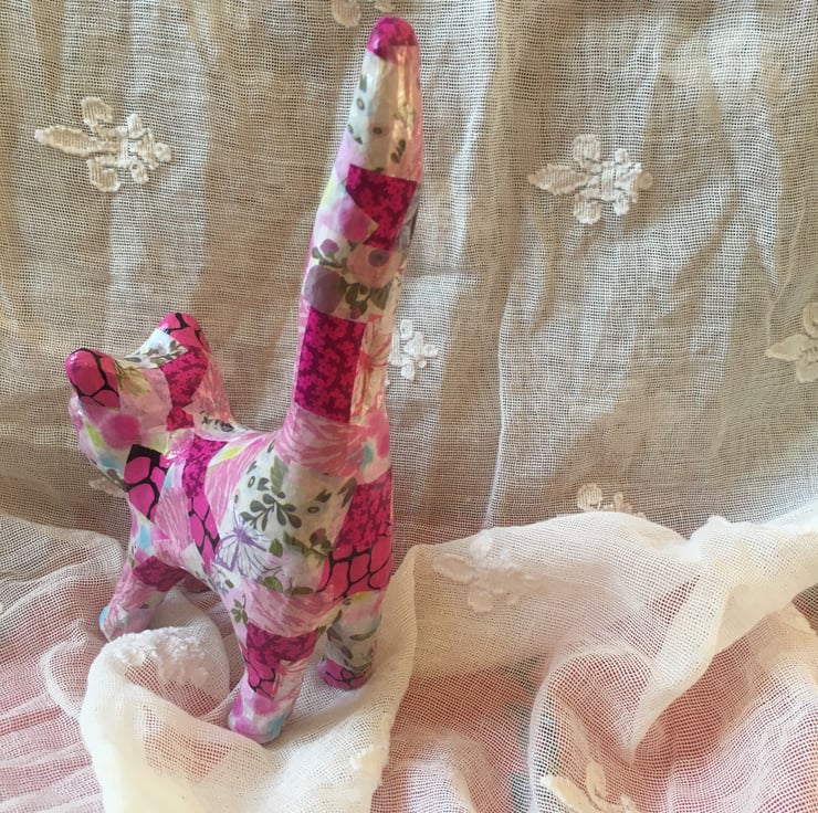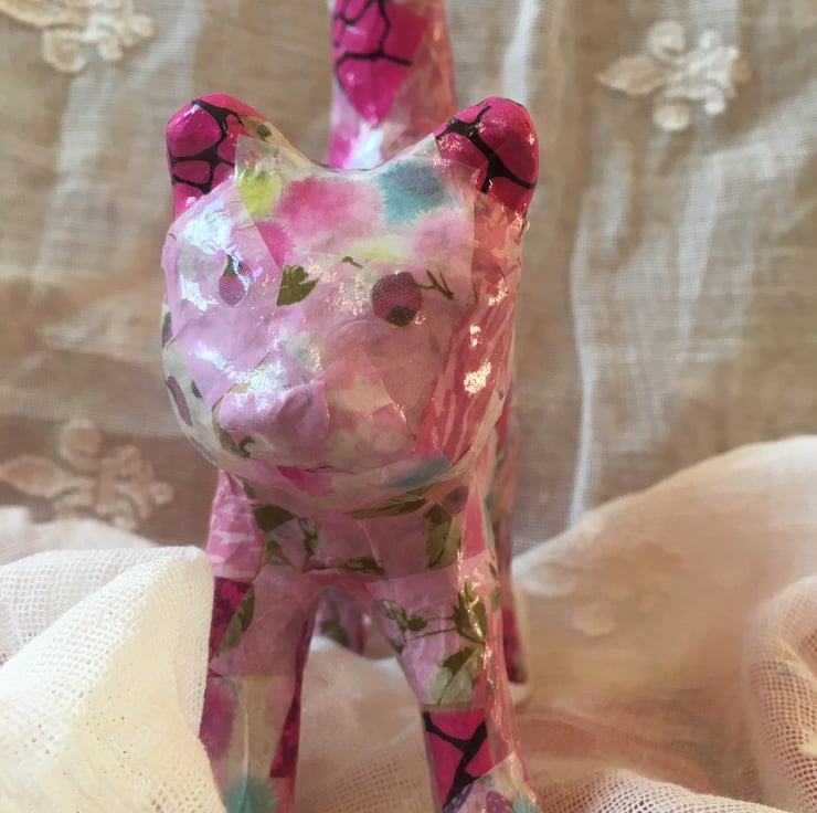 This papier mache cat has been decorated in mainly pink papers but also has hints of green, lilac and blues . This is a smaller version of the bigger pink cat but still as pretty in pink.