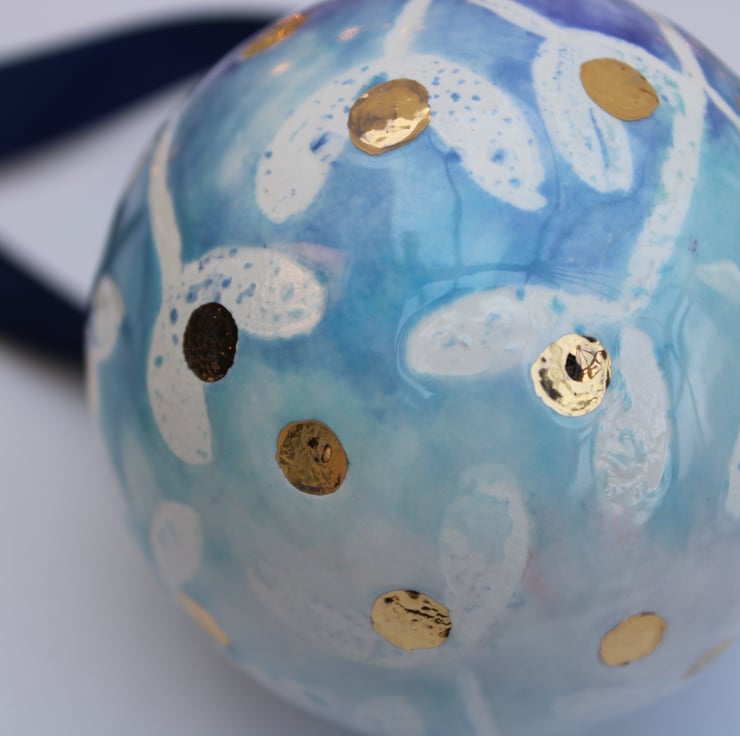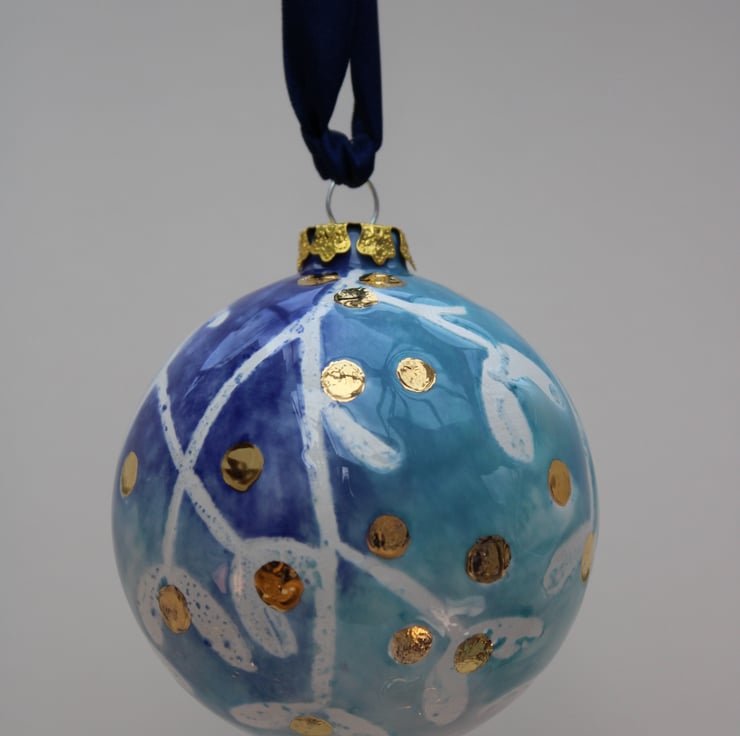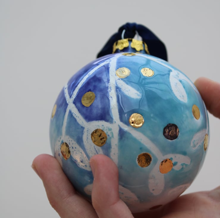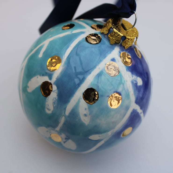This bauble is hand painted in bright glaze by myself. So will always be unique. I use a mix of wax resist and glaze to create a wonderfully nobly bobbly effect. Finished off with bright gold lustre and hung on dark blue ribbon. Making them super eye catching and festive.