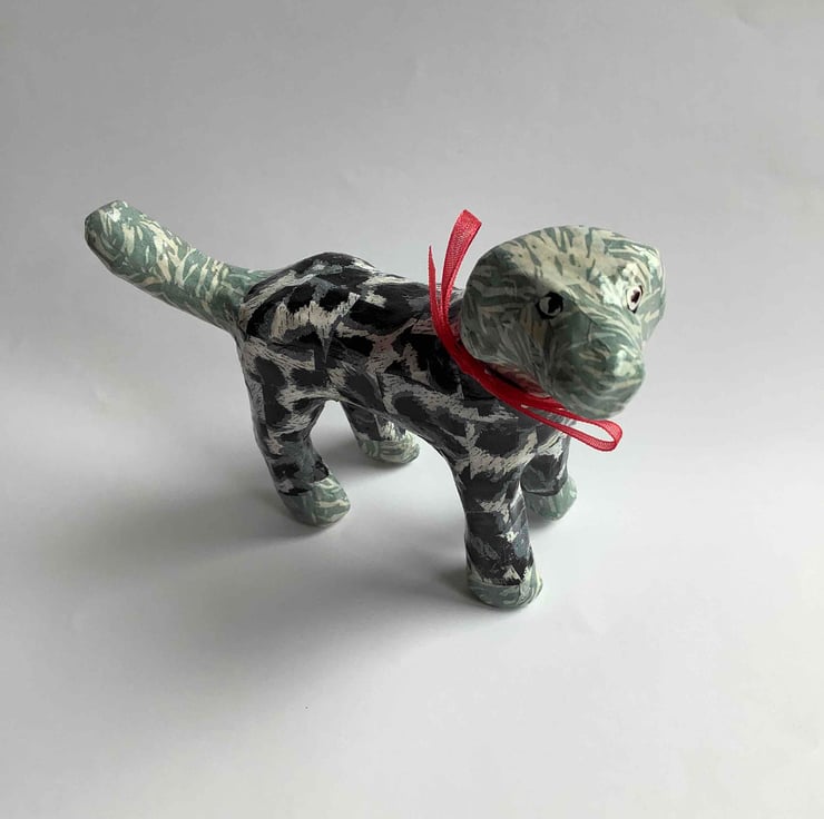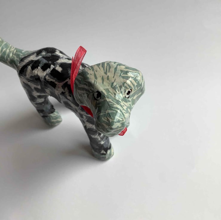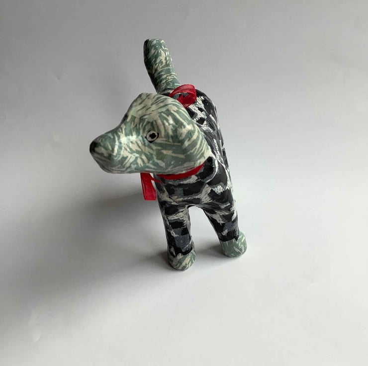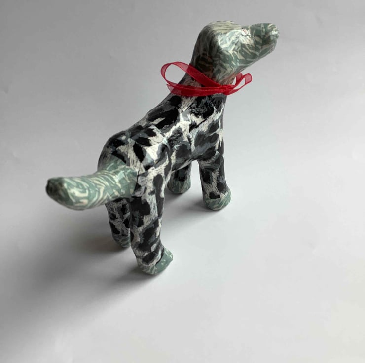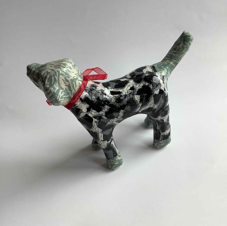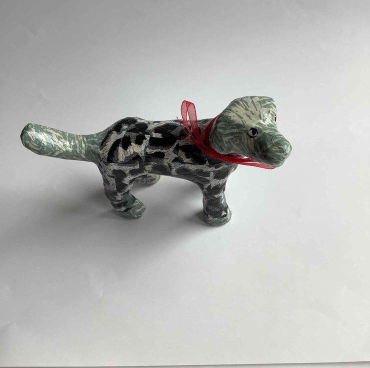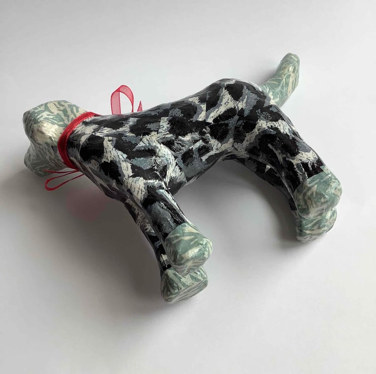 This wee papier mache dog is decorated with grey and black papers and varnished.