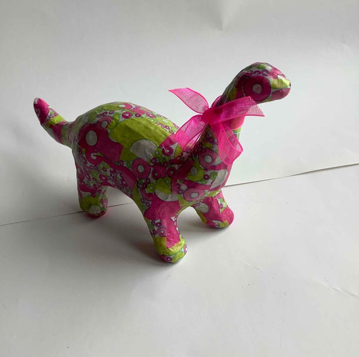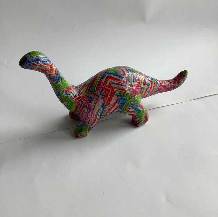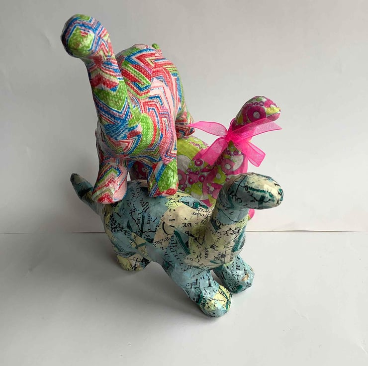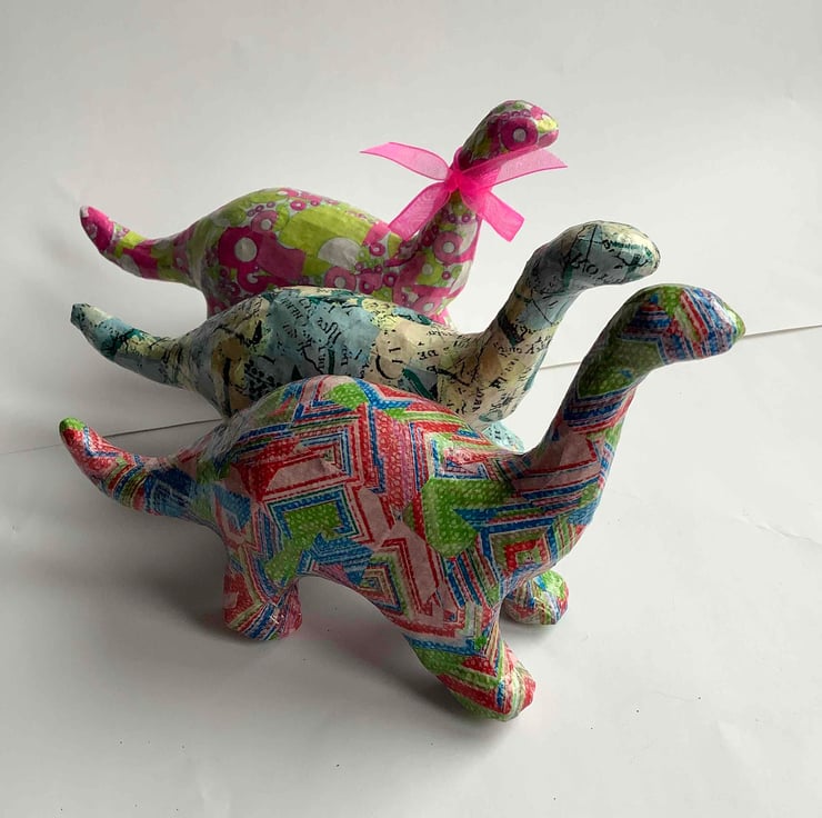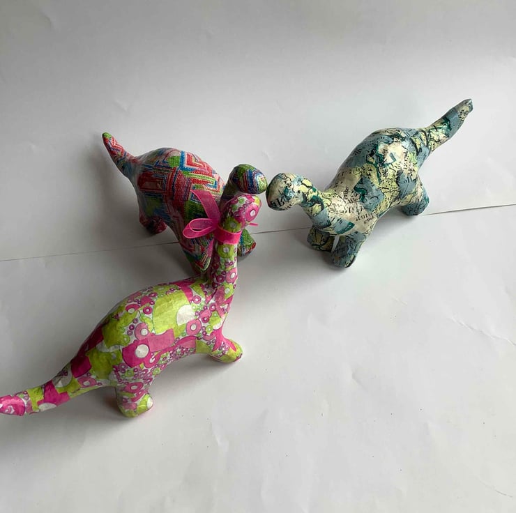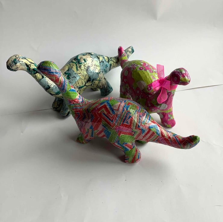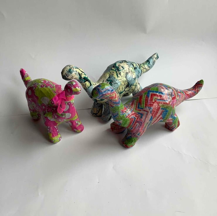 These 3 Papier mache dinosaurs have been decorated In various coloured papers and varnished.