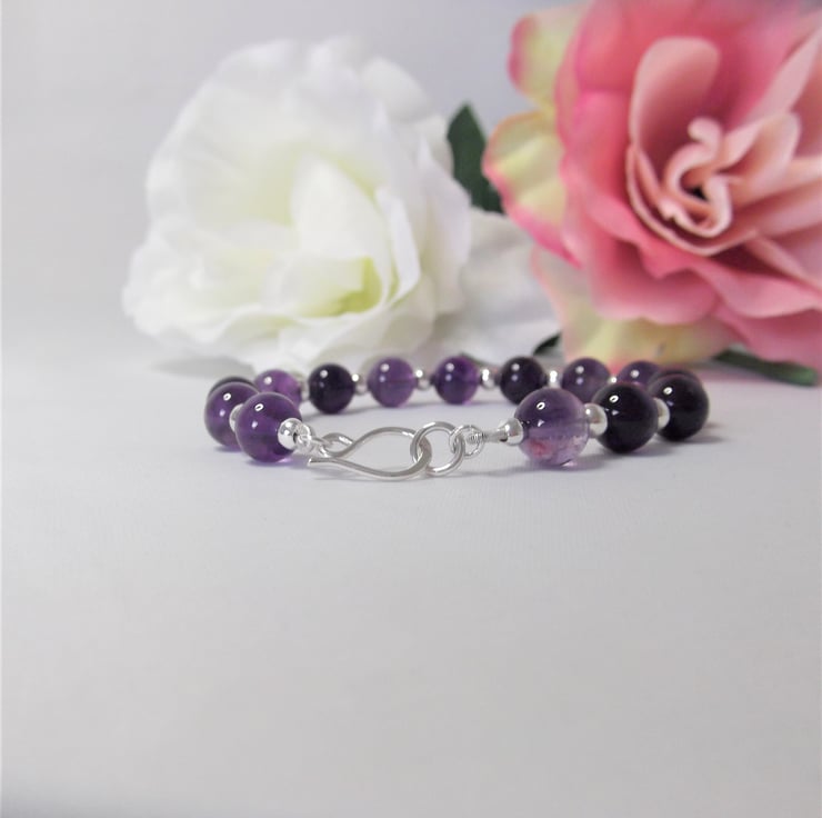 This handmade bracelet is a perfect blend of natural beauty and thoughtful design. It measures approx. 7 inches long and features beautiful dark purple Amethyst gemstone beads paired with recycled silver beads.