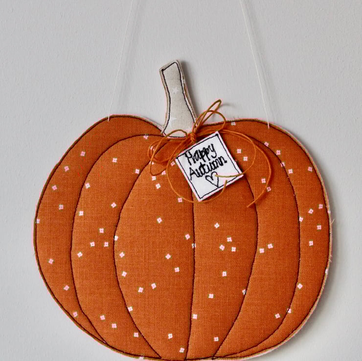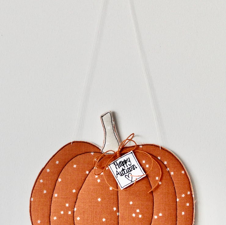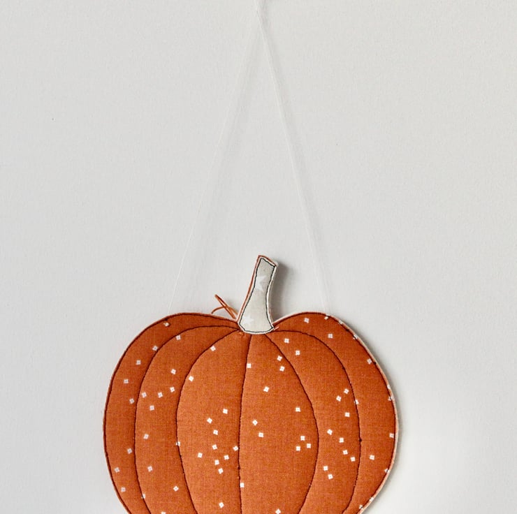 Each pumpkin is sewn using cotton cloth, 100% wool felt and free hand machine embroidery; multiple layers of cloth are sewn together and cut out by hand using very sharp scissors. With a linen string to suspend.