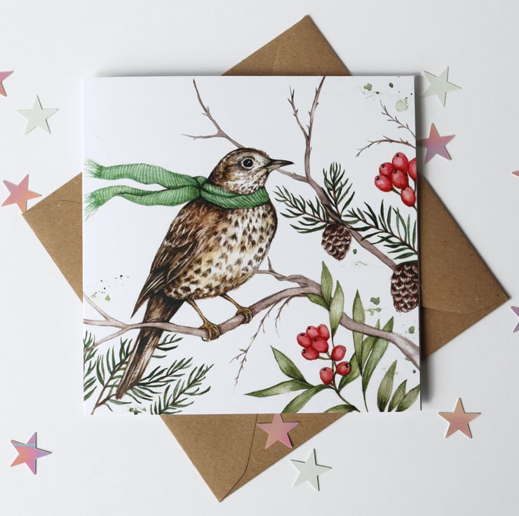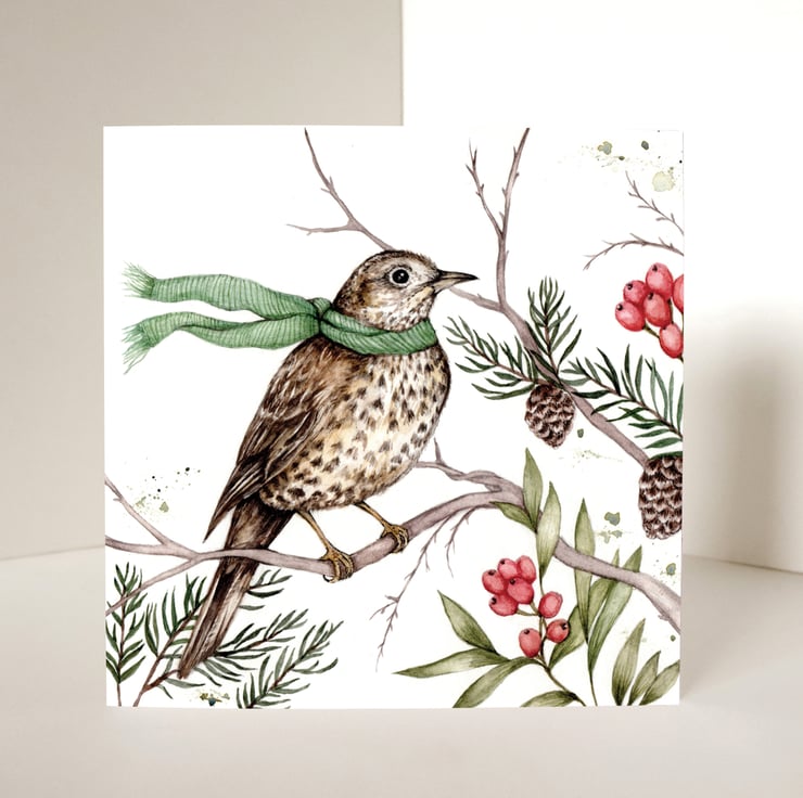 Festive greetings card, featuring a song thrush keeping warm in the wintery weather! Surrounded by festive foliage and berries from my original watercolour illustration.