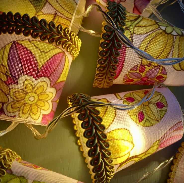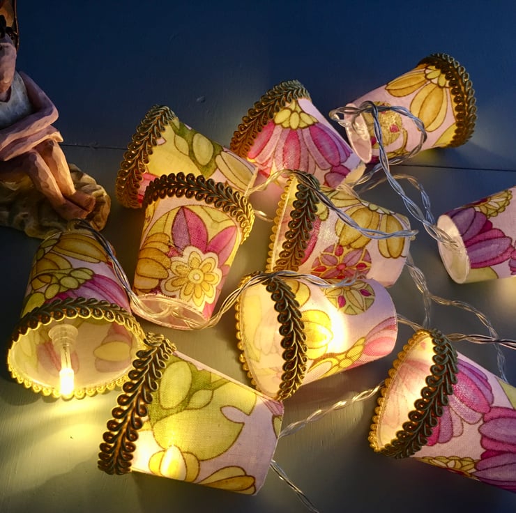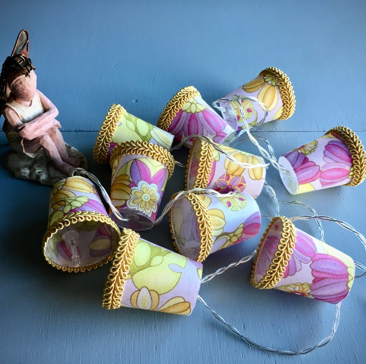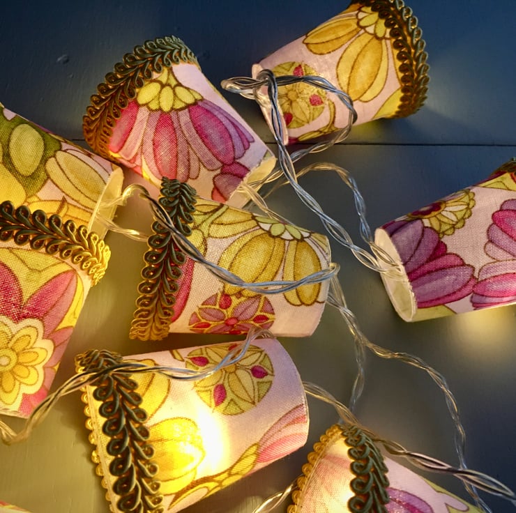 These mini lampshades are perfect to drape along a mantlepiece or shelf, around the head of a bed, or strung across a mirror or picture frame.