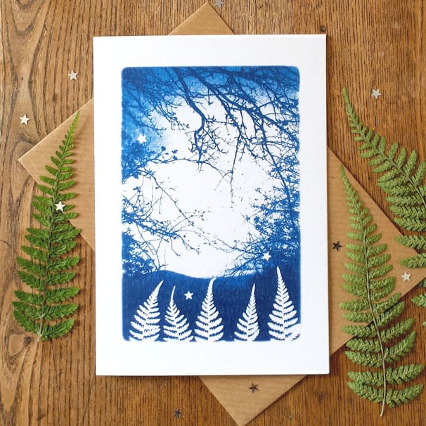 To create the original I used the old photographic process of Cyanotype - a light sensitive solution is applied to Bockingford watercolour paper, a large format negative placed on with actual ferns and stars then exposed to sunlight, the solution is then rinsed off and the paper dried, fixing the image.