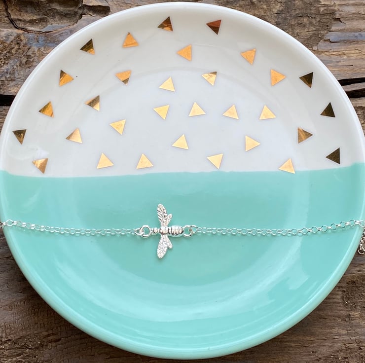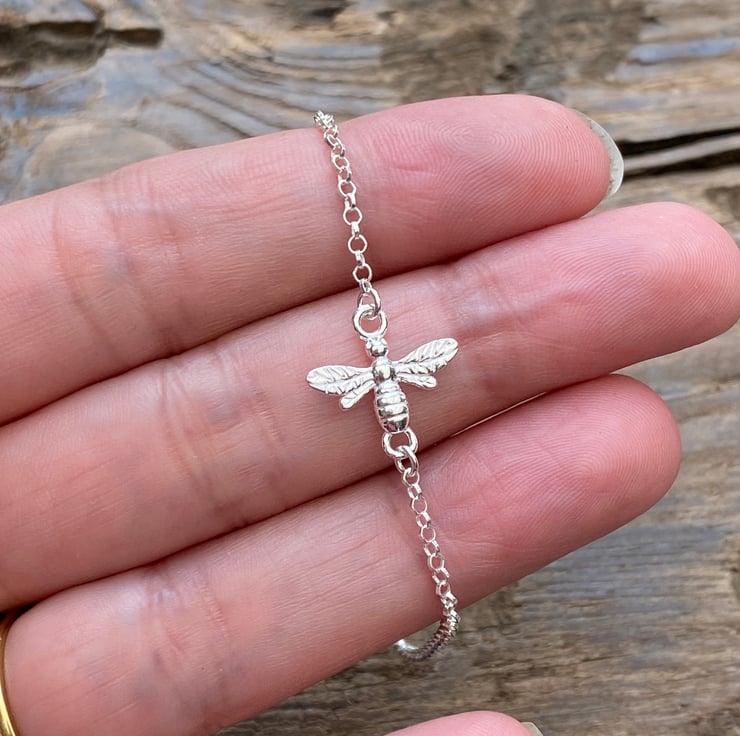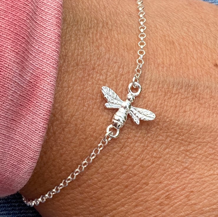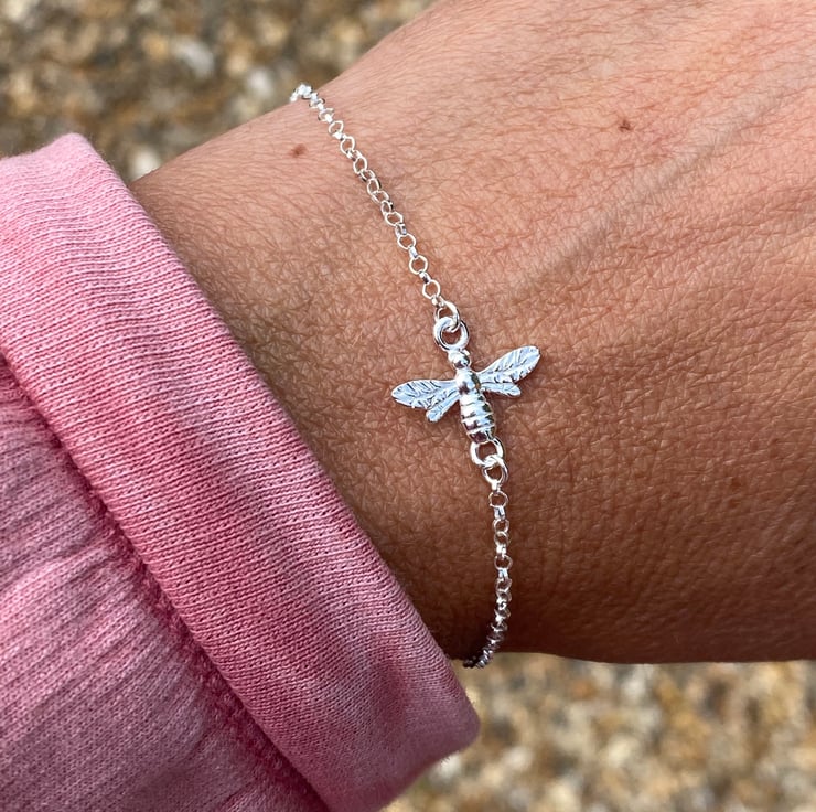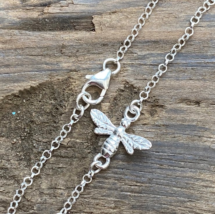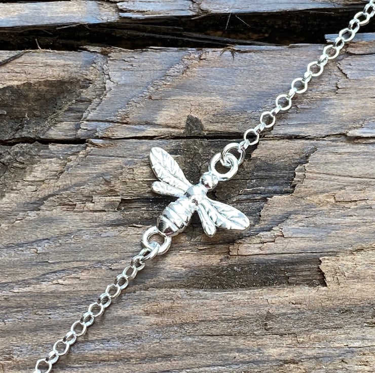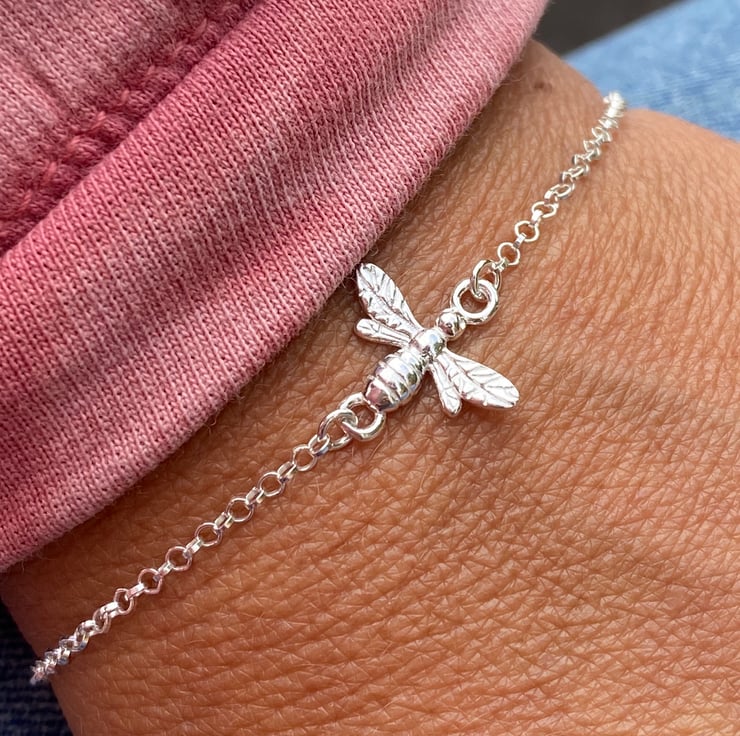 Handmade bee charm bracelet made with sterling silver belcher chain and a 15mm sterling silver bee link connector charm. Fastened with a lobster clasp.