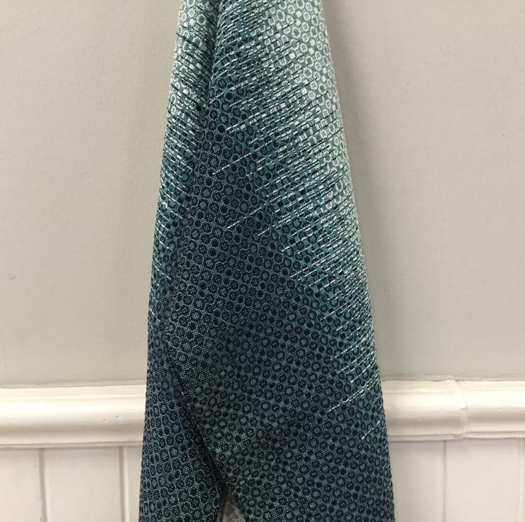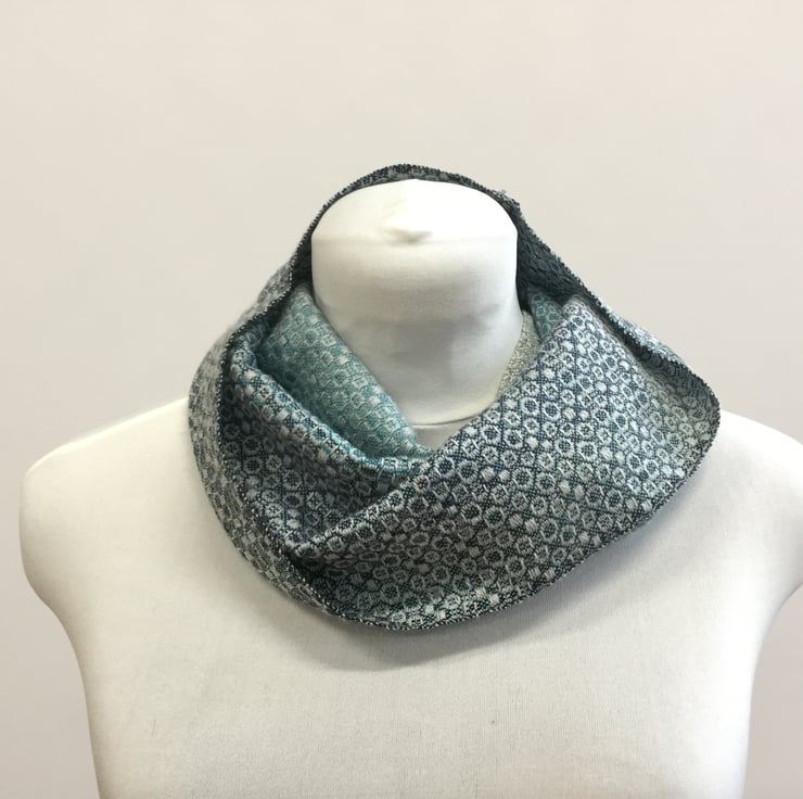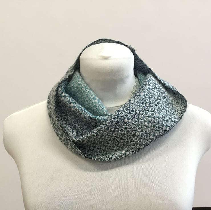 Beautifully soft handwoven cowl in fine cotton. Handwoven on my custom-made loom using a Fibonacci graduated warp from navy blue, though teal to turquoise, sea green and ecru. The draft is an old American miniature overshot, forming tiny circles like rain on the sea.