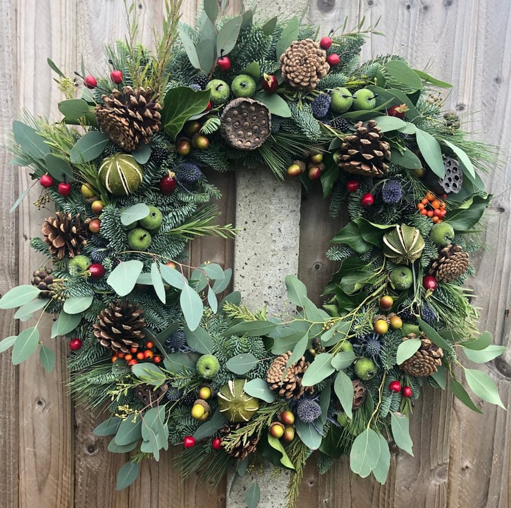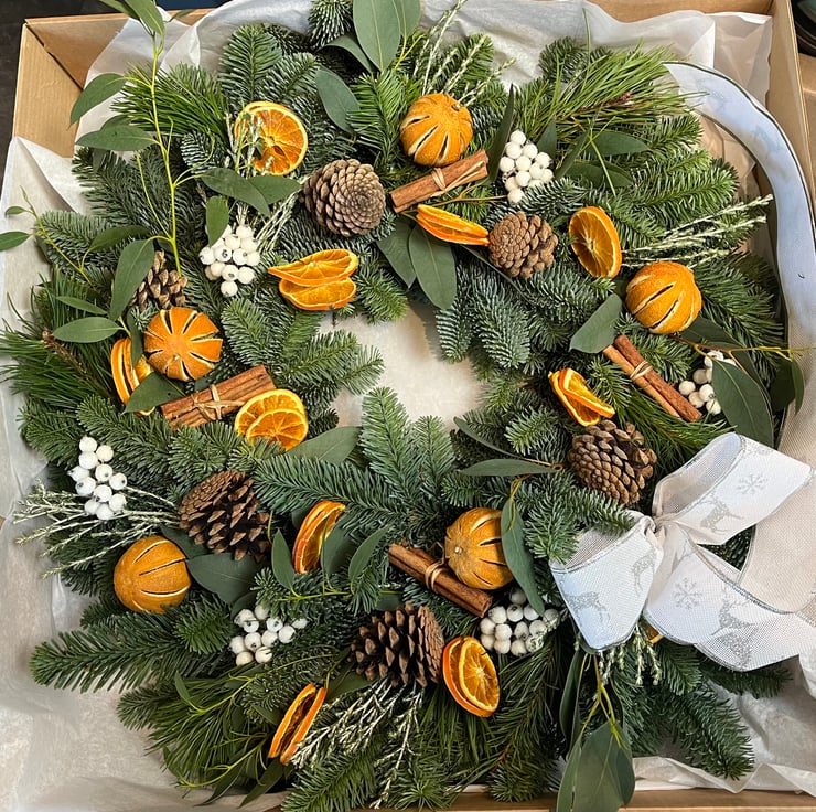 Winter greenery of perfect smelling pine fern and spruce, decorated with pine cones, lotus seed heads, oranges, apples, cinnamon sticks and much much more. Fresh and made to order just for you.