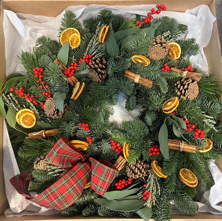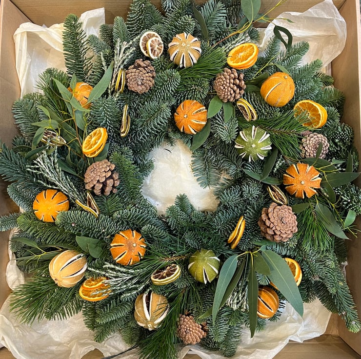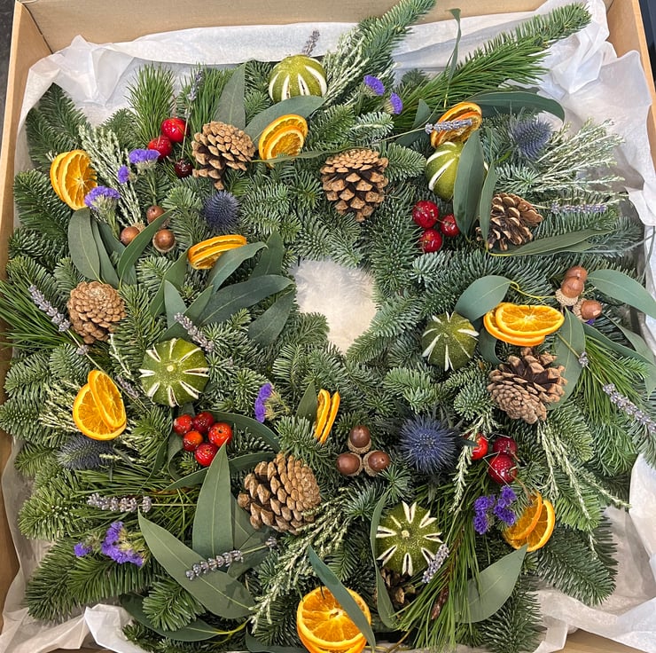 Each wreath ships in a sturdy box and measures roughly 40cm x 40cm and 15cm depth.