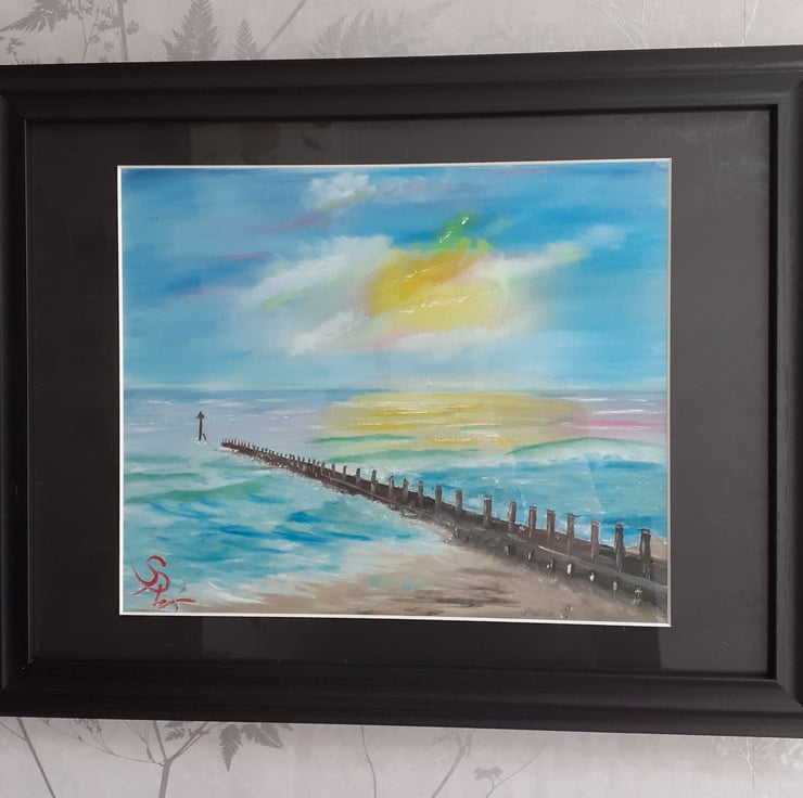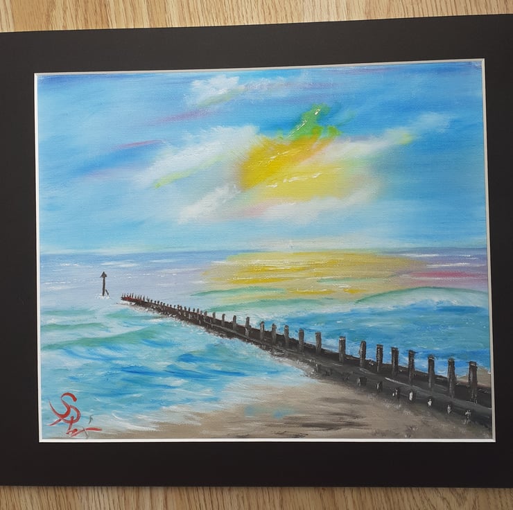 You can imagine the calm sound of the sea against the seabreak 12"by10" signed, Oil painting on canvas board in a Black Mount. Total size is 16"by12" and can be framed.
