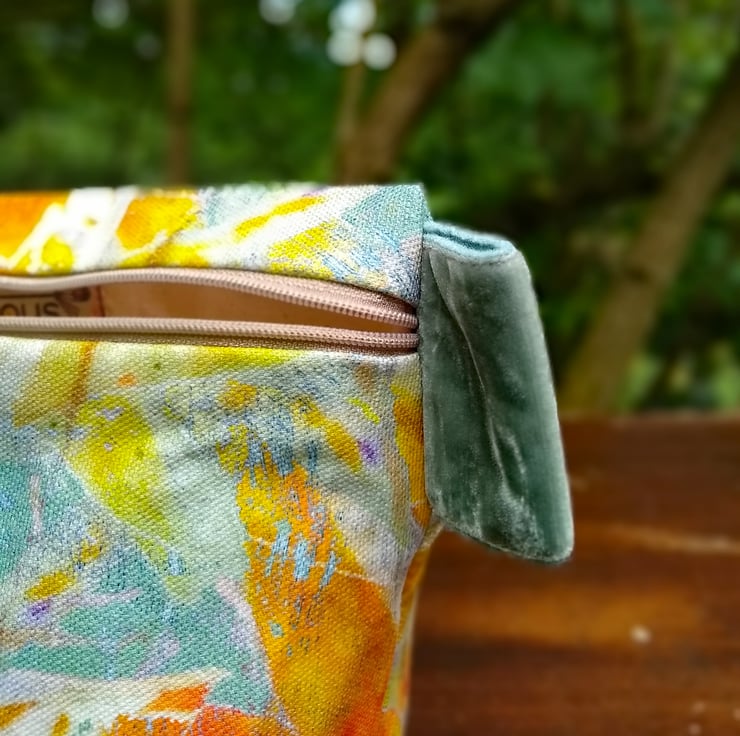 A useful little zip pouch, featuring my abstract 'Hafren' design printed onto a sturdy cotton by a company in the UK. Lined in washed calico with a zip fastening, felt- lined velvet tab and finished with decorative buttons, it would make an original and decorative gift.