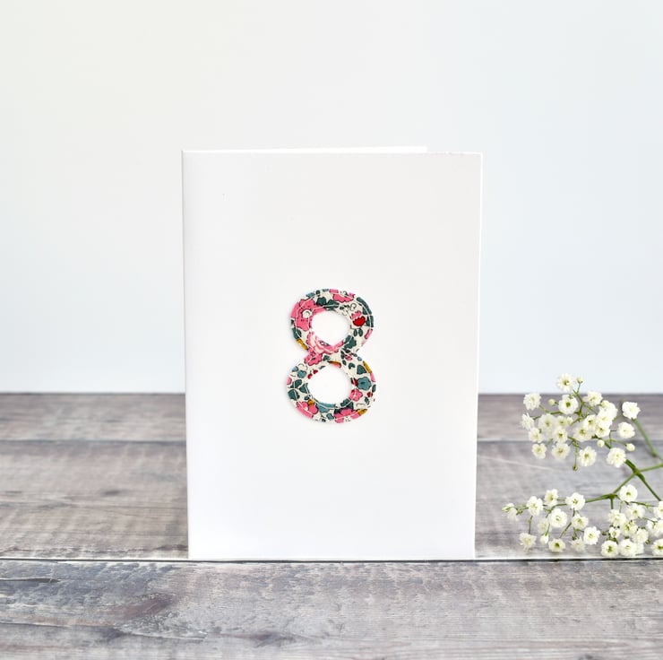 Made using pretty Liberty fabric the number eight has been stitched directly onto the front of the card using freehand machine embroidery.