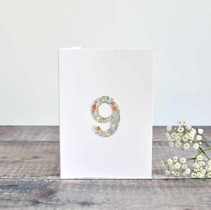 Made using pretty Liberty fabric the number nine has been stitched directly onto the front of the card using freehand machine embroidery.