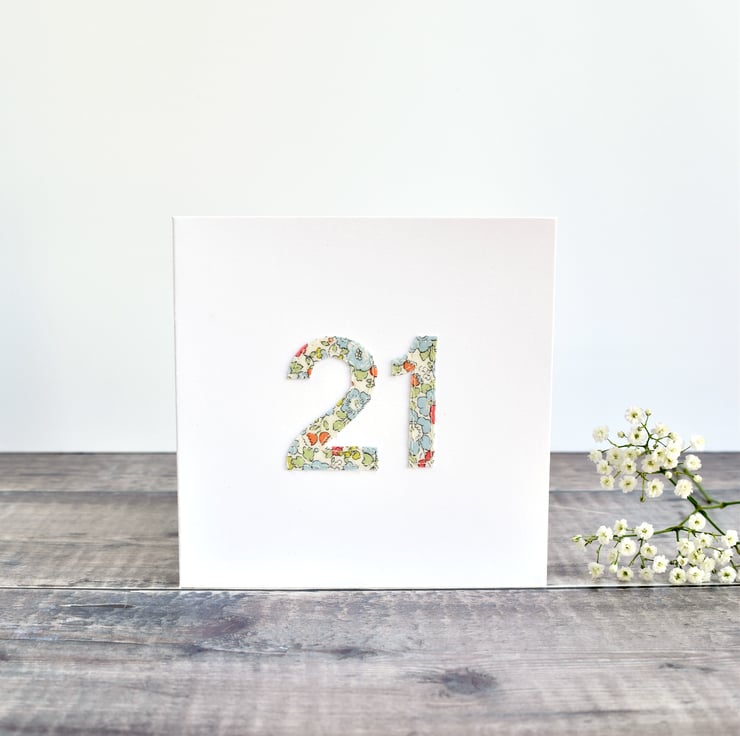 Made using pretty Liberty fabric the number twenty-one has been stitched directly onto the front of the card using freehand machine embroidery.