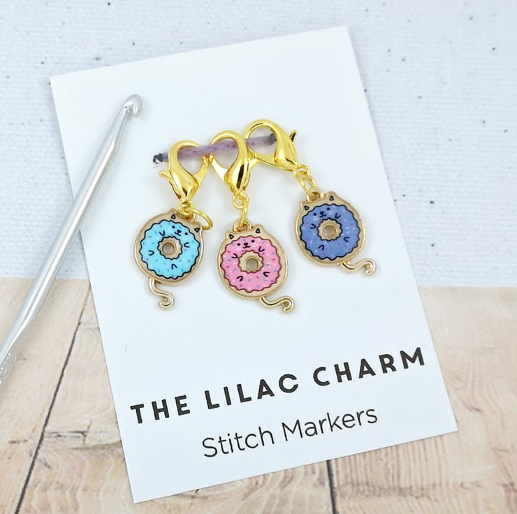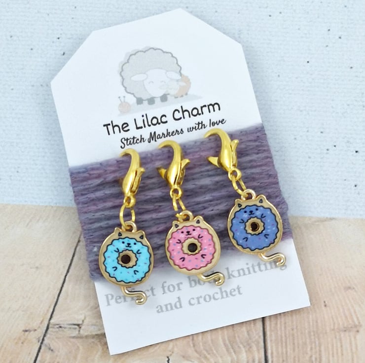 Set of 3 Cat Donut Stitch Markers. Perfect for knitting and crochet.